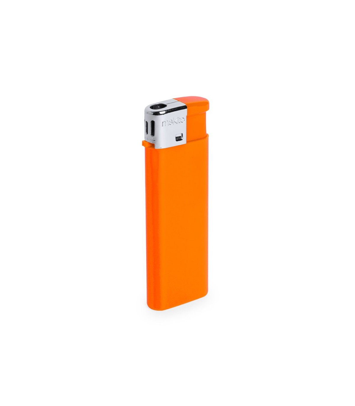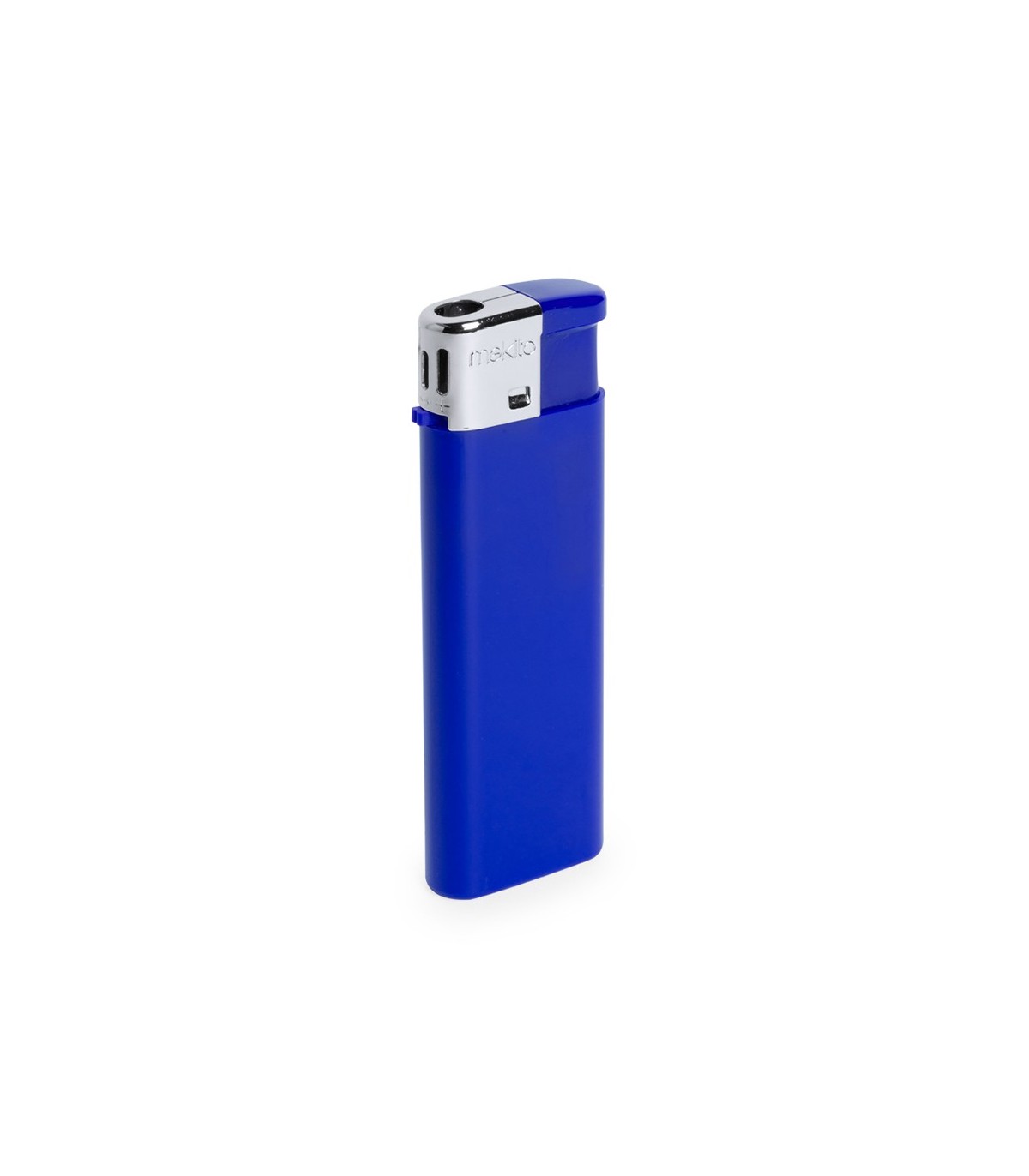 Encendedor a gas recargable, de mecanismo eléctrico en varios colores para personalizar. Con regulador de llama y protección infantil.