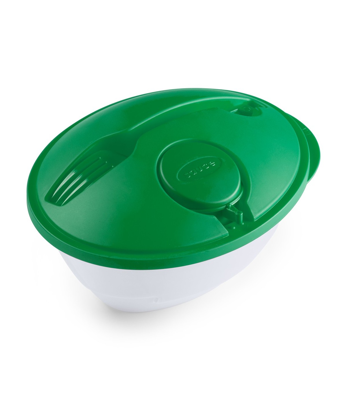 Ensaladera de 1.200ml de capacidad en material PP. Con cuerpo translúcido y tapadera con tenedor y botecito para aliño integrados. En variada gama de colores y apta para lavavajillas.