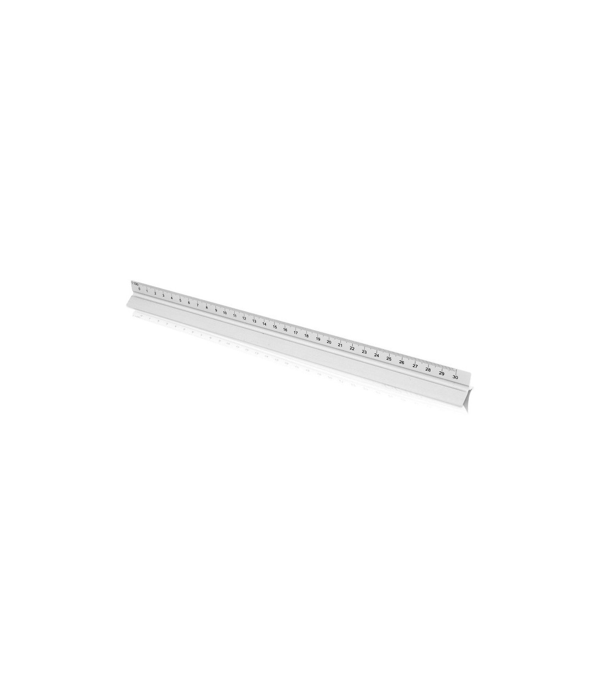 Escalímetro de aluminio en diseño triangular de 30cm. Escalas 1:20/1:25/1:50/1:75/1:100. Con cara lisa para marcaje. Presentado en caja individual.