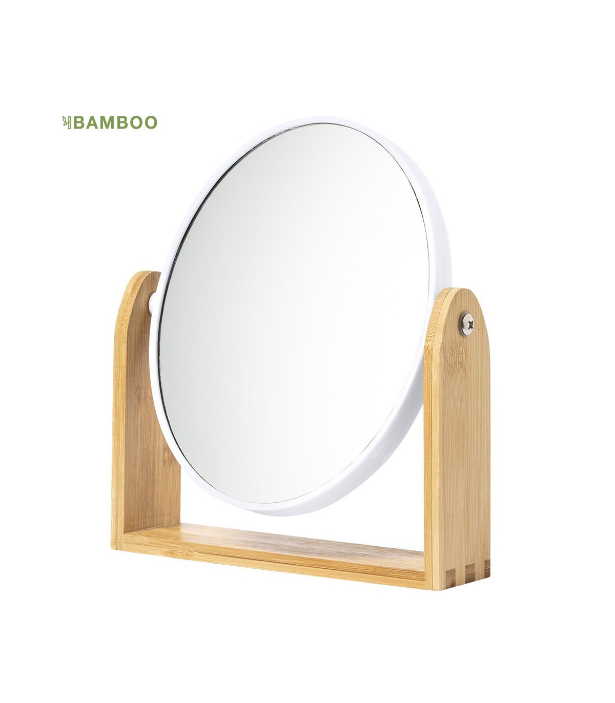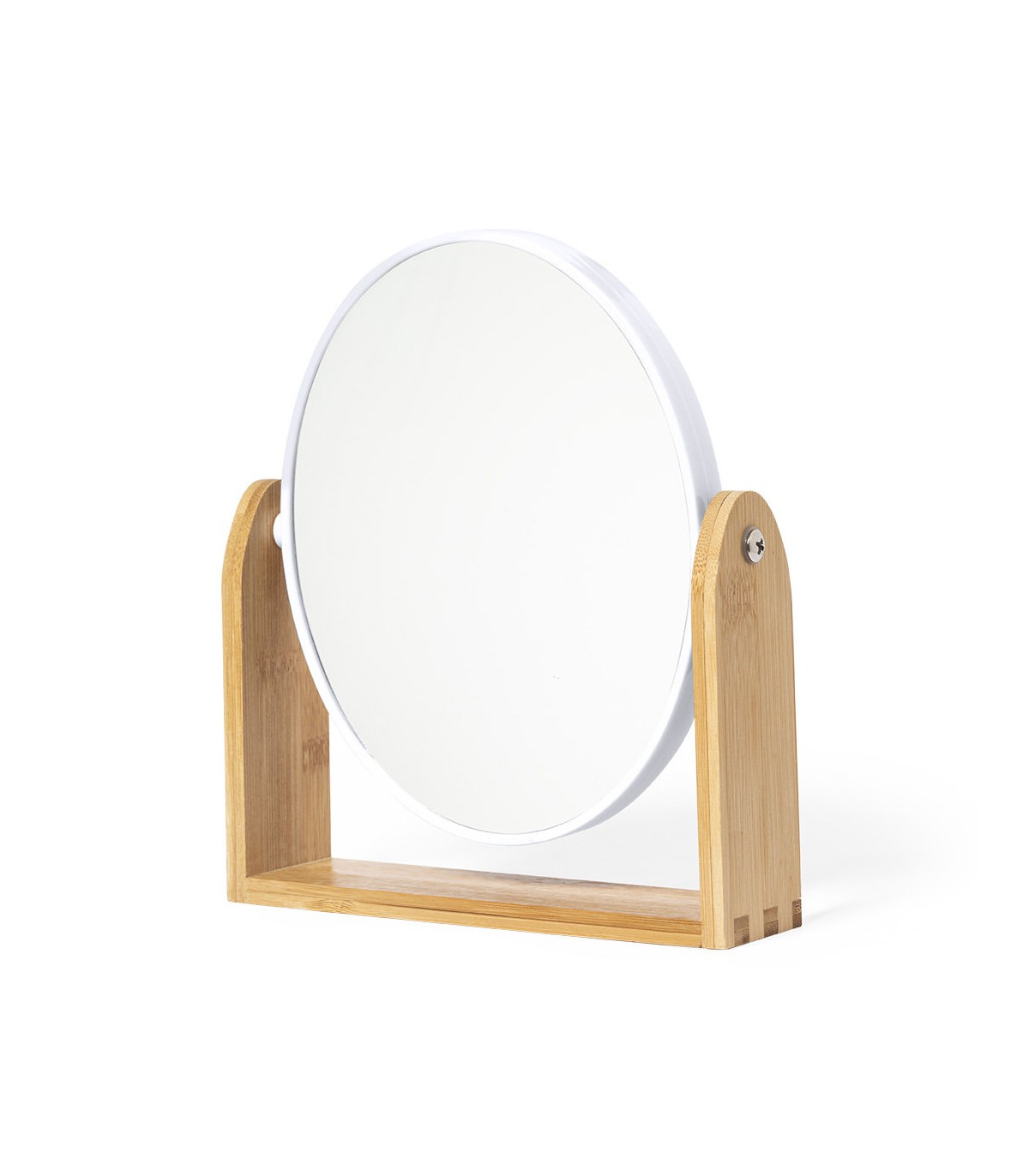 Espejo de sobremesa de fabricación ecológica elaborado en bambú. Con dos espejos (1X y 3X). Presentación en caja individual de diseño eco.