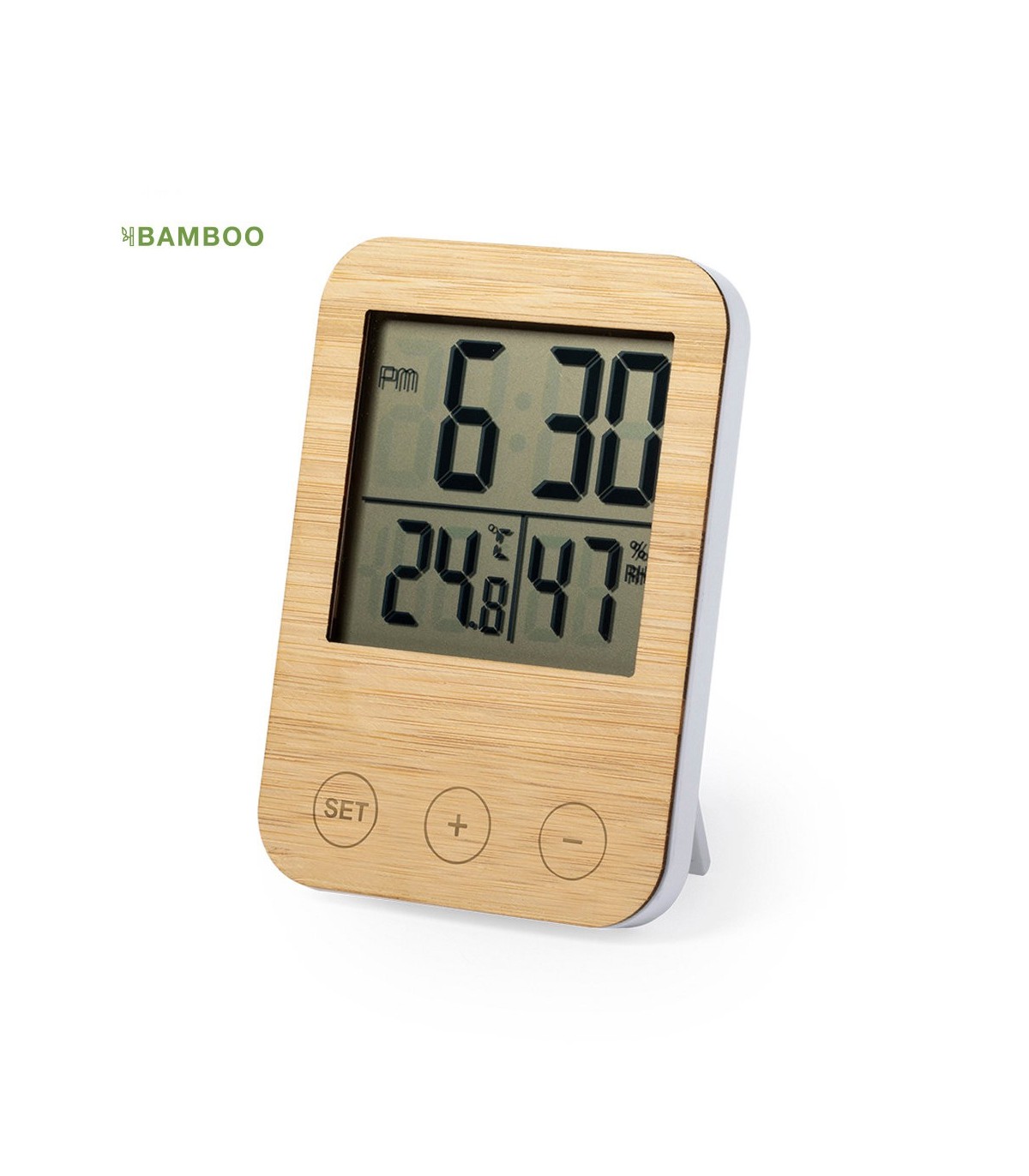 Estación meteorológica de línea ecológica con frontal en bambú. Funciones higrómetro y termómetro. Alimentación a pilas (2xAAA no incluidas) y presentado en atractiva caja de diseño eco.