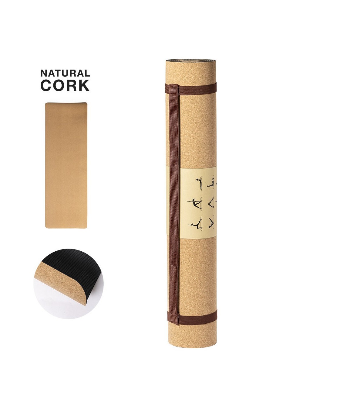 Esterilla de fabricación ecológica para la práctica del yoga y otras actividades. elaborada en resistente corcho natural, con base antideslizante en TPE. Tamaño 60x180 cm, con asa de transporte y presentada en atractiva funda individual de diseño eco, con ilustraciones de ejercicios.