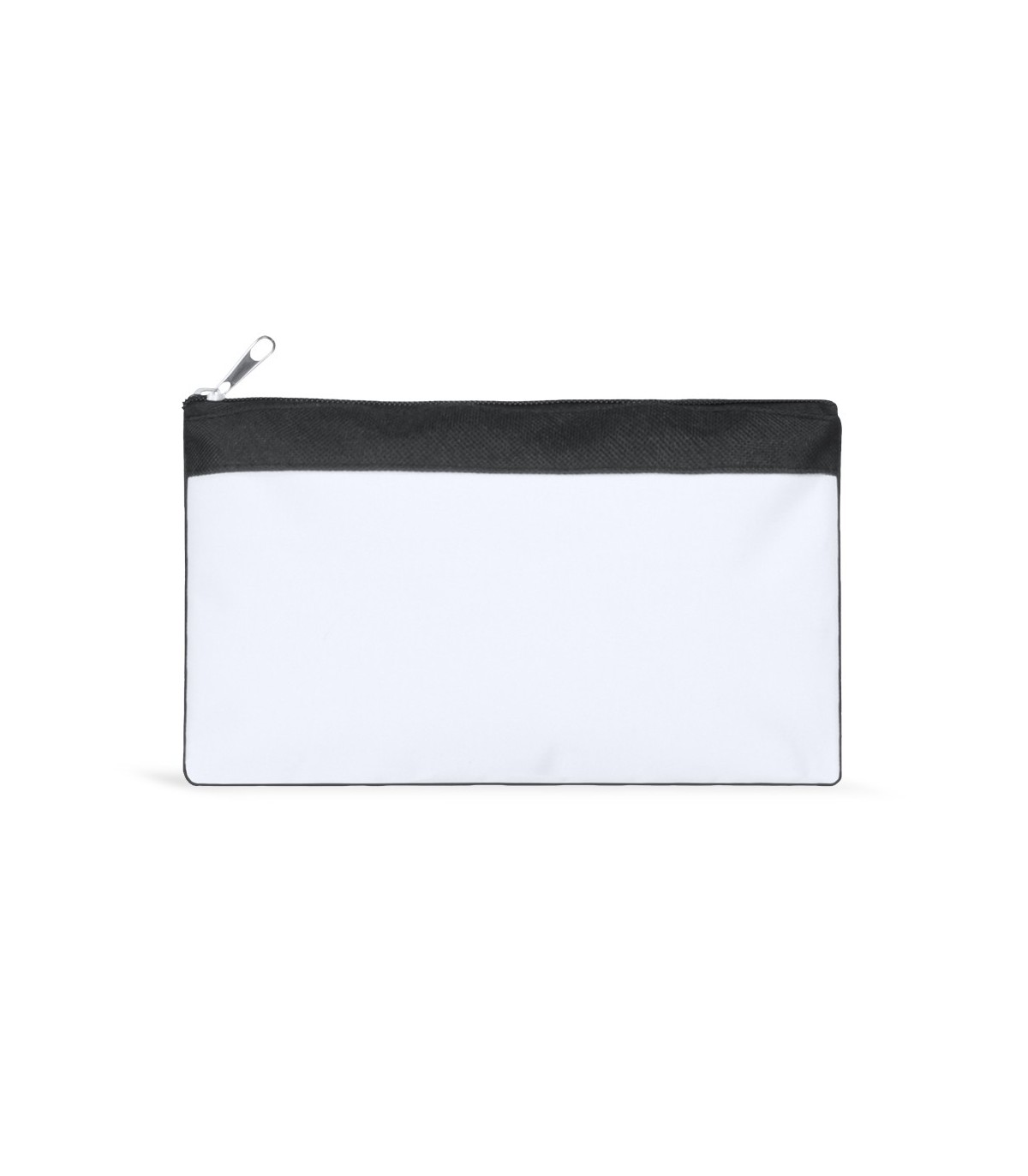 Estuche en elegante poliéster 600D en combinación de colores negro y blanco. Compartimento principal con cierre de cremallera.