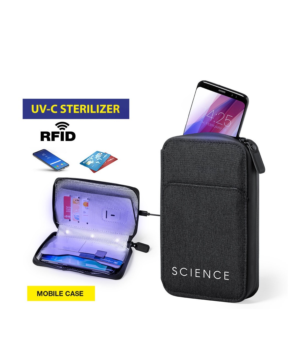 Organizador y esterilizador de luz ultravioleta tipo C, con protección RFID (Identificación por Radio Frecuencia) que mantiene seguros tus dispositivos de transmisión de identidad. Especialmente diseñado para la eliminación de microorganismos y bacterias en smartphones y otros objetos de uso cotidiano. Fabricada en resistente poliéster 600D de acabado denim, con cierre magnético de seguridad en tirador para un uso seguro del dispositivo. Incluye 4 tarjeteros interiores + bolsillo exterior. Presentado en atractiva caja individual de diseño. Potencia LED 1.2W y longitud de onda 275nm. Tiempo de esterilización con función auto-apagado de 1 y 3 minutos. Disponible manual de usuario en español e inglés. Disponible certificación CE, RoHS y de efectividad germicida. Para un uso adecuado del producto, evitar el contacto con la piel y los ojos.