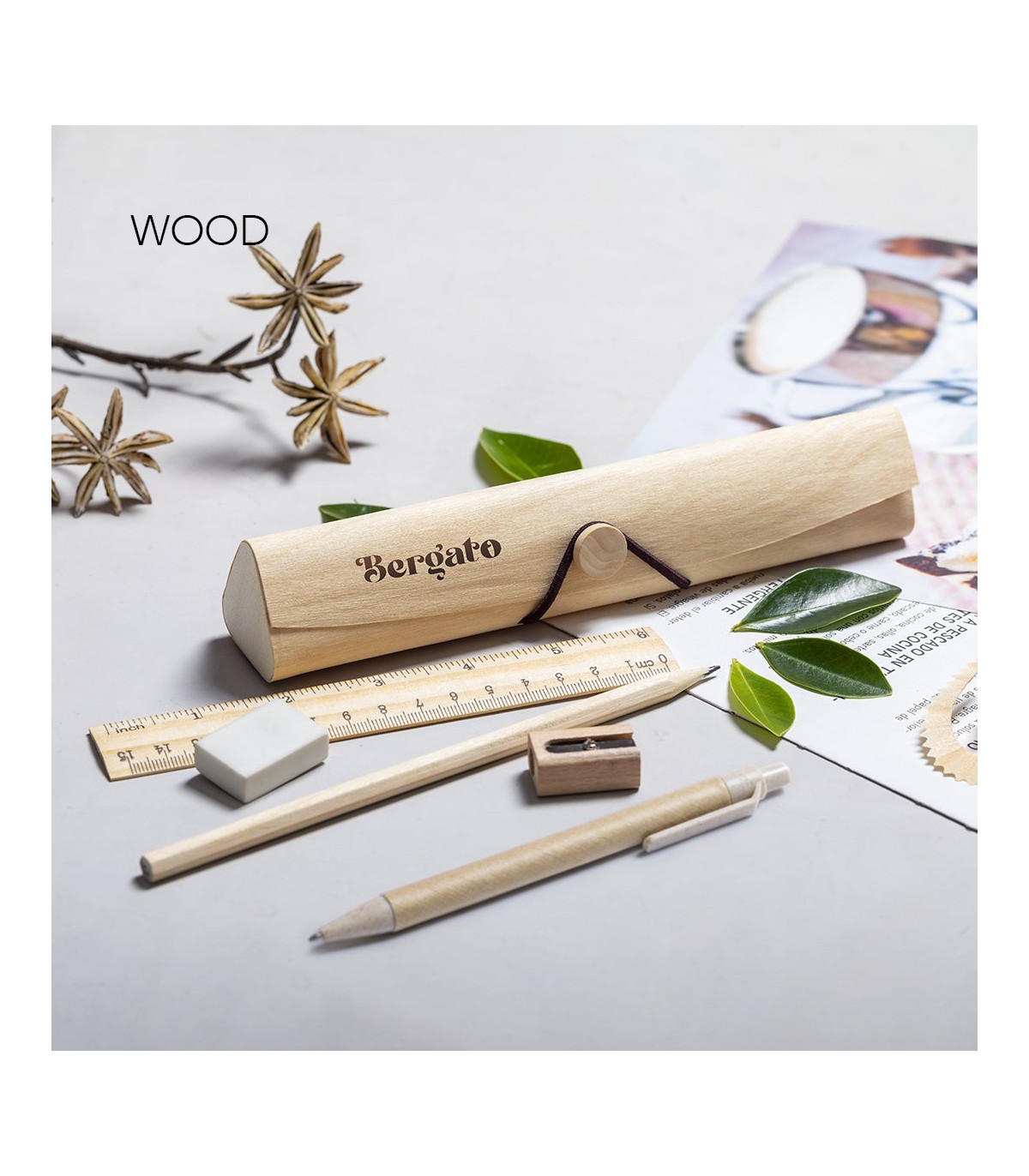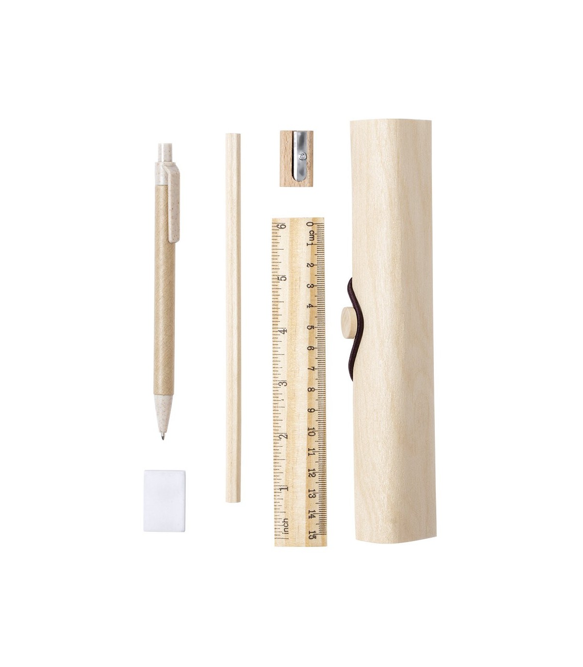 Estuche de línea ecológica fabricado en madera, con cinta elástica de cierre. 5 accesorios incluidos: 1 x bolígrafo de mecanismo pulsador en cartón reciclado, con accesorios en caña de trigo y tinta azul. Distintivo caña de trigo en la parte superior del bolígrafo. 1 x lápiz de madera de 177 mm de largo x 7mm de diámetro (punta sin afilar) 1 x regla de madera de 15 cm / 6 pulgadas 1 x sacapuntas de madera 1 x goma blanca