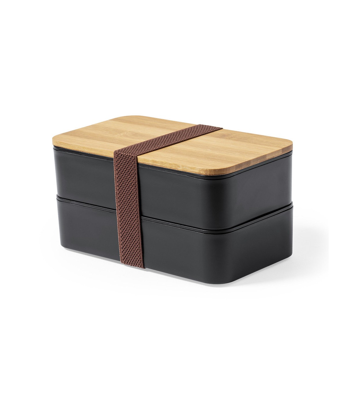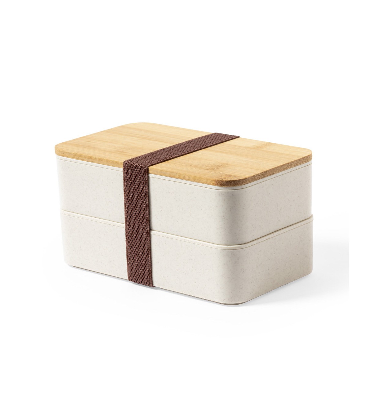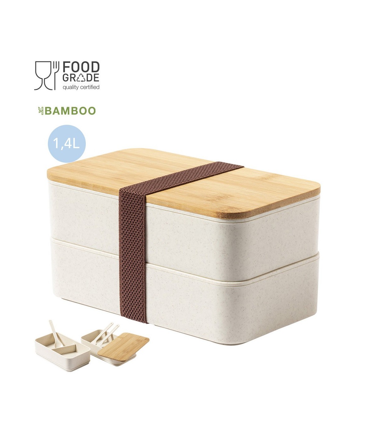 Fiambrera de 1,4l en resistente material PP veteado libre de BPA, con tapa de bambú. Dos compartimentos, cada uno de 700 ml de capacidad. Compartimento interior con tenedor, cuchara y cuchillo. Incluye cinta de seguridad exterior. Certificación Food Grade, garantizando la seguridad cuando los alimentos entran en contacto con el material usado para fabricar el producto.