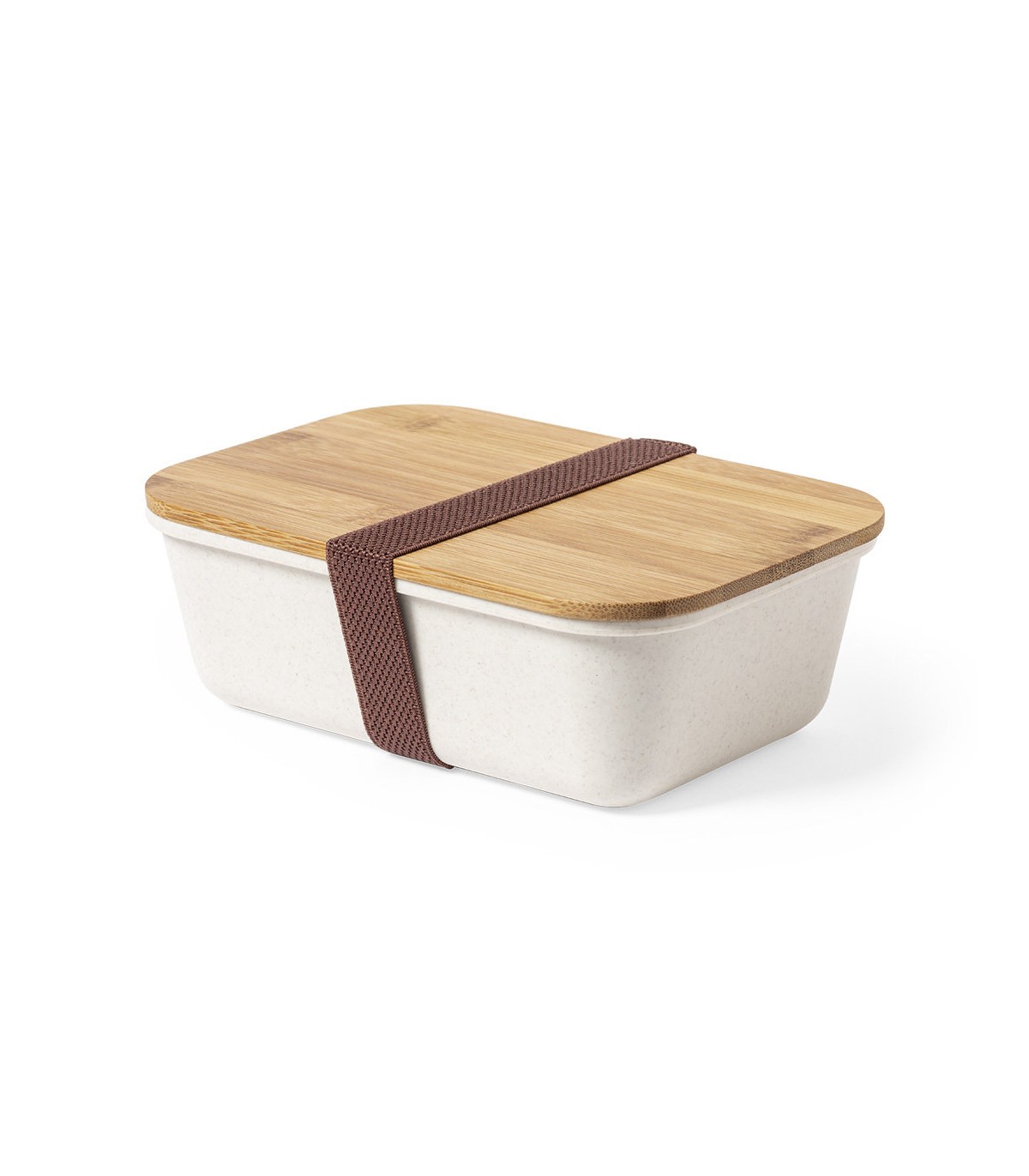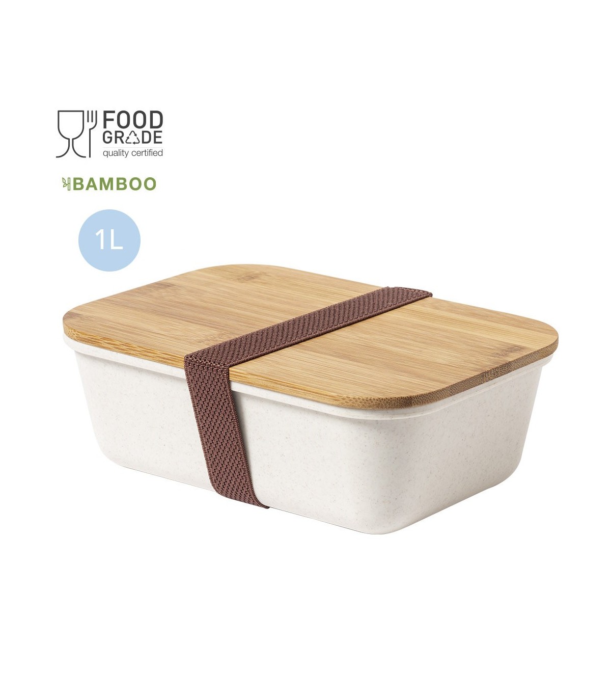 Fiambrera de 1l en resistente material PP veteado libre de BPA, con tapa de bambú. Cinta elástica de seguridad en tapa y certificación Food Grade, garantizando la seguridad cuando los alimentos entran en contacto con el material usado para fabricar el producto.
