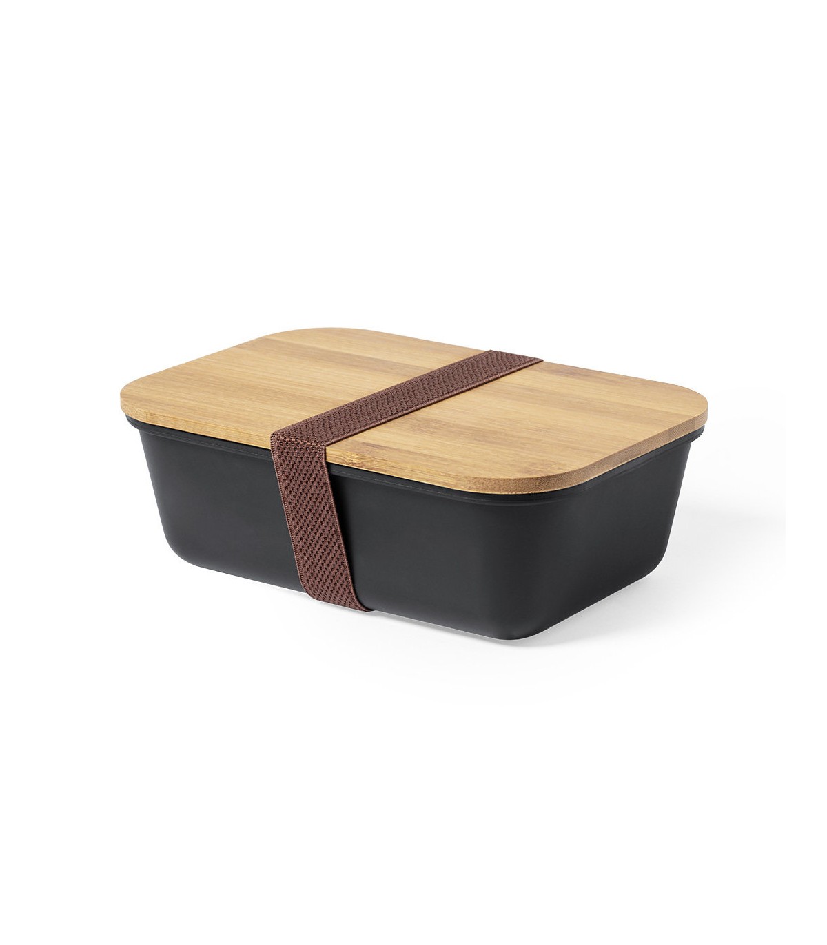 Fiambreras de 1l en resistente material PP veteado libre de BPA, con tapa de bambú. Cinta elástica de seguridad en tapa y certificación Food Grade, para regalos de empresa.