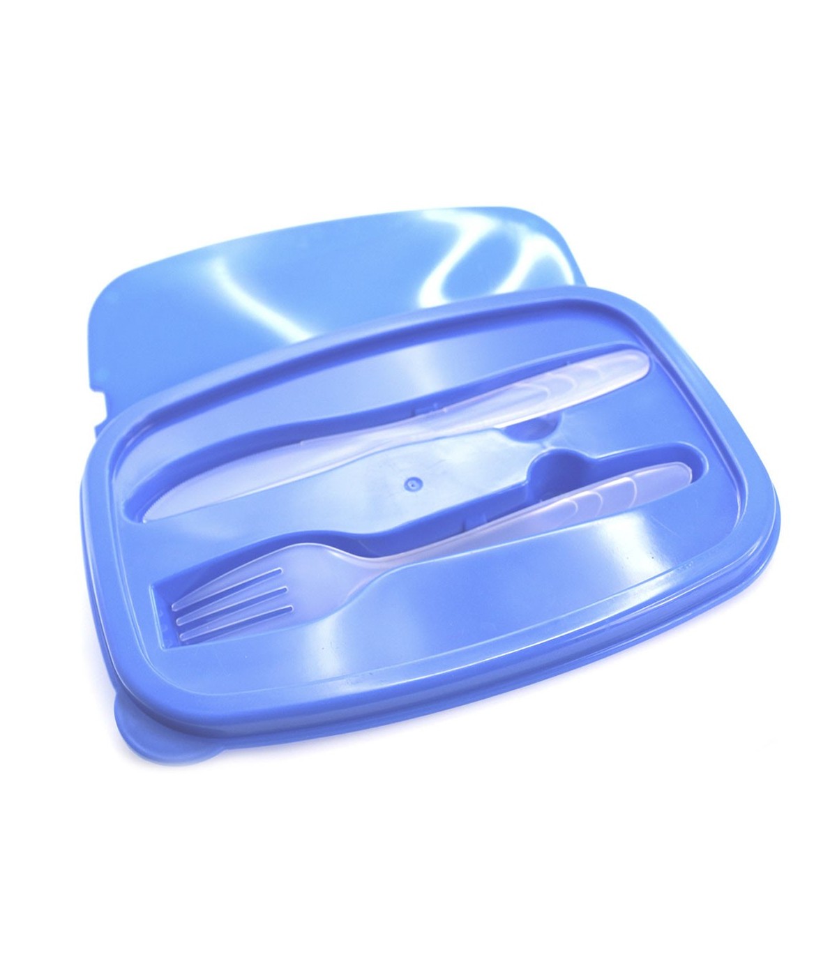 Fiambrera de 1000ml de capacidad en material PP. Con cuerpo translúcido, interior con dos compartimentos y tapadera portacubiertos -incluidos cuchillo y tenedor- en variada gama de colores. Apto para microondas, lavavajillas y congelador.
