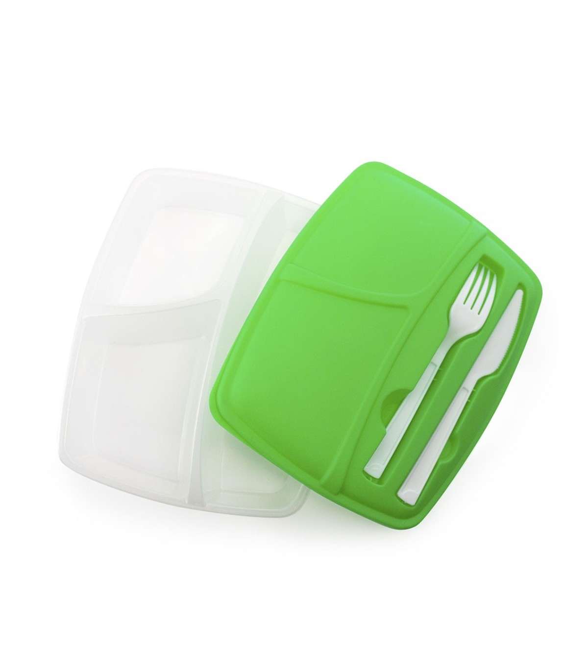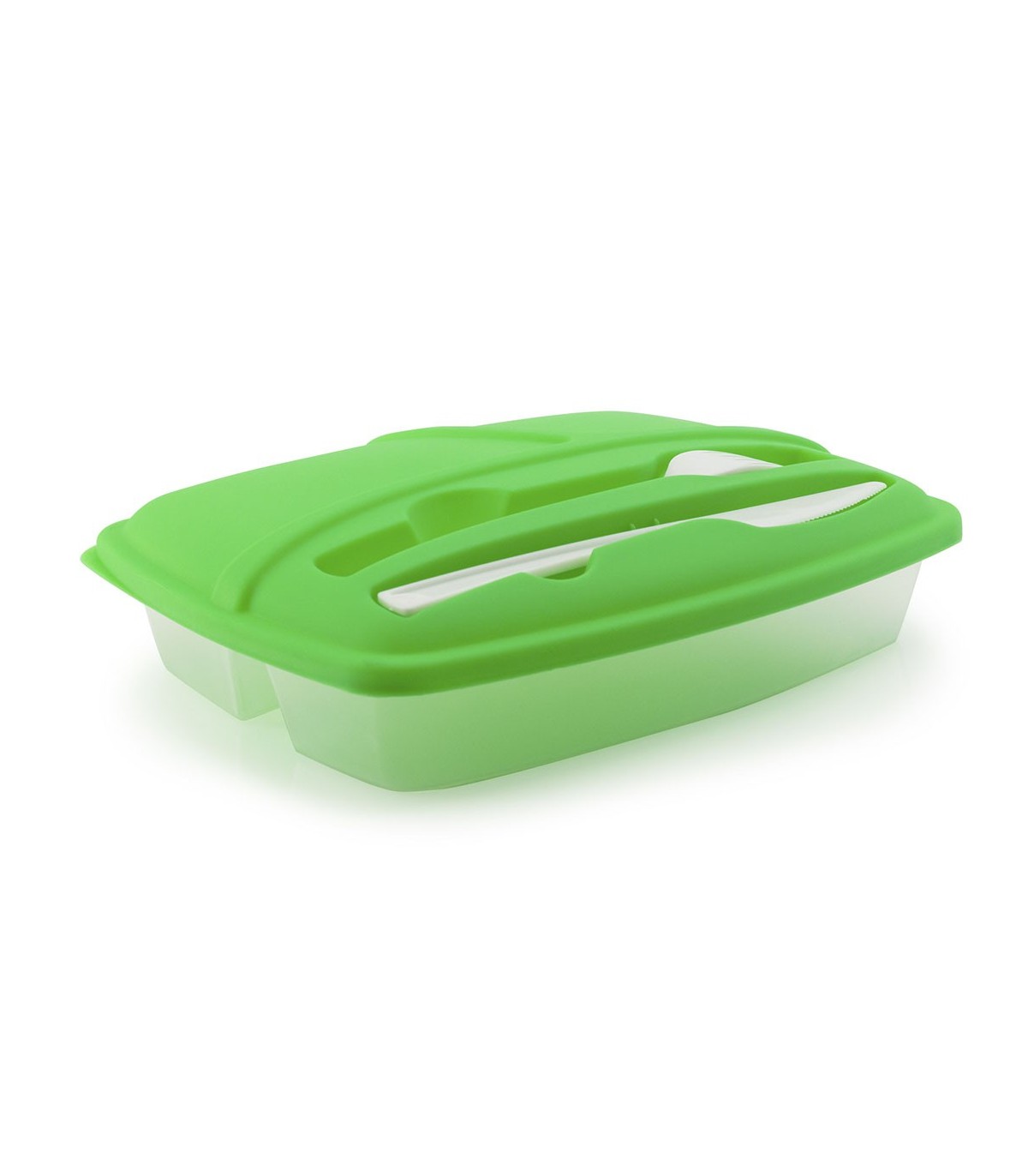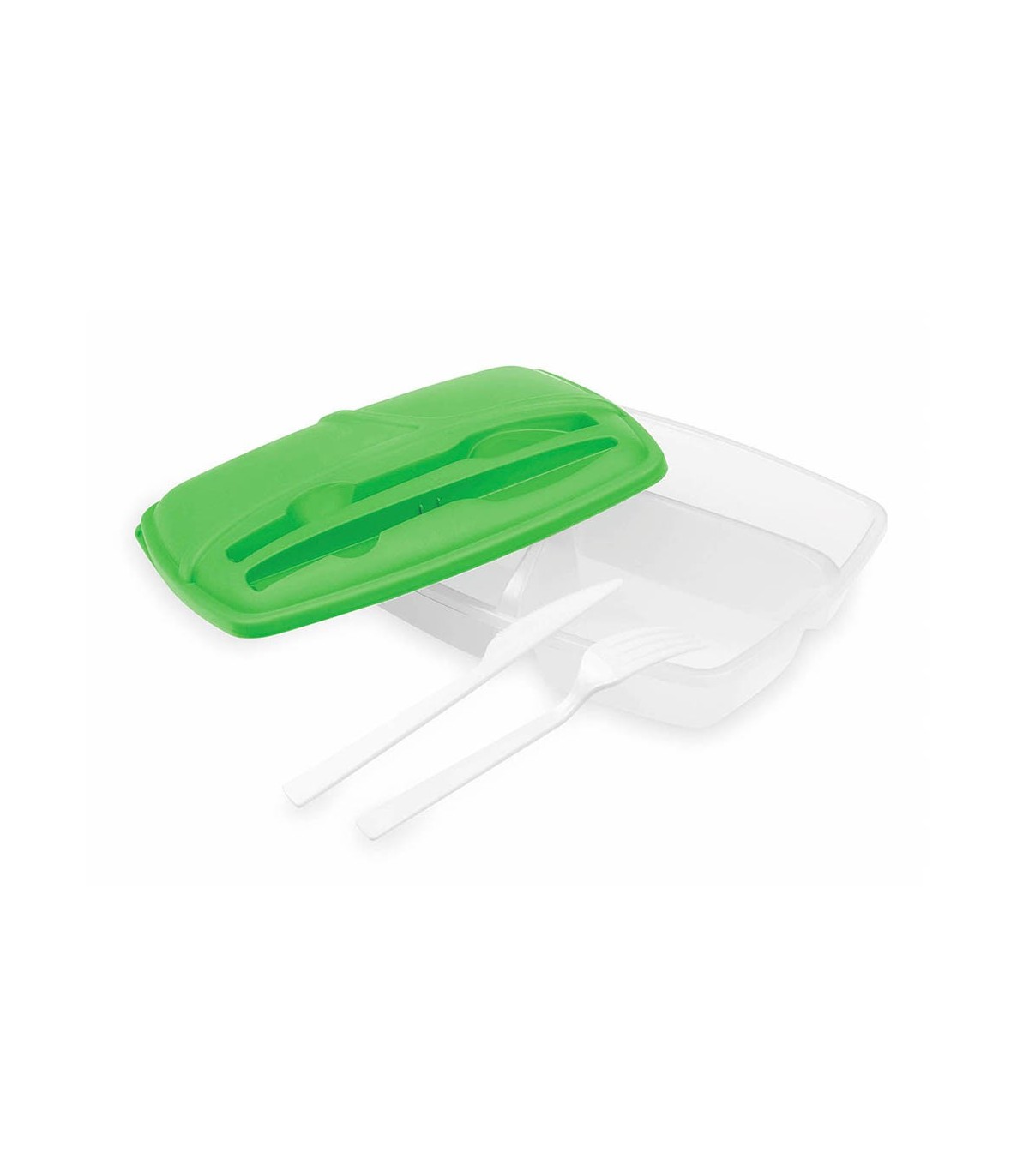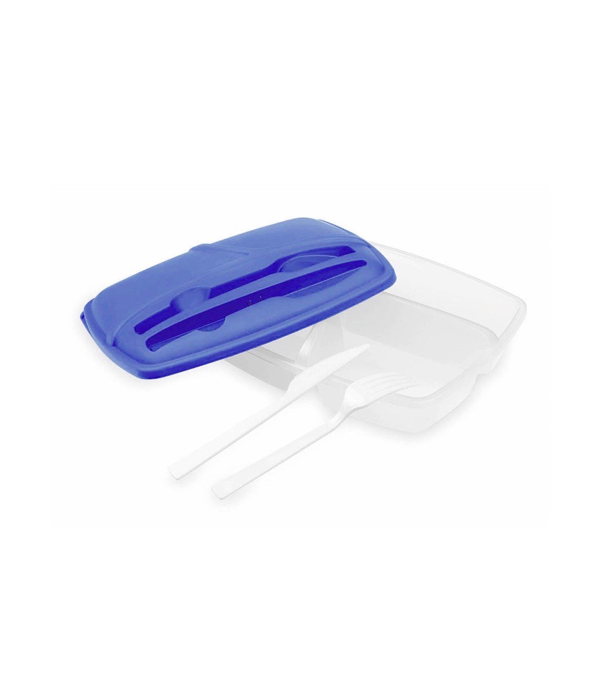 Fiambrera de 800ml de capacidad en material PP. Con cuerpo translúcido, interior con dos compartimentos y tapadera portacubiertos -incluidos cuchillo y tenedor- en variada gama de colores. Apta para lavavajillas.