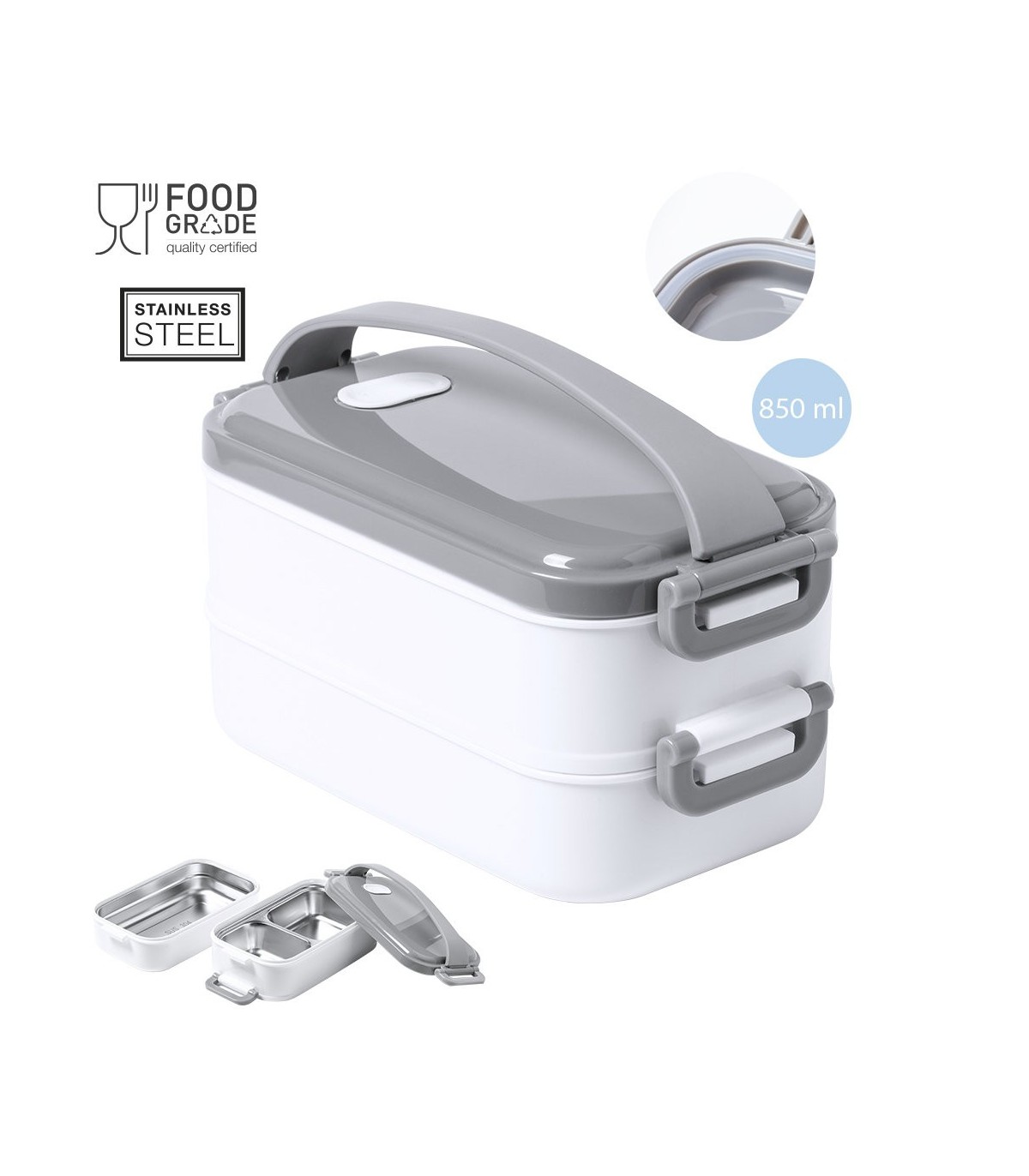 Fiambreras térmicas fabricadas en acero inox y PP, libre de BPA. Incluye 2 compartimentos independientes con bandejas en acero inox y cierre hermético, de 500ml y 350ml de capacidad.