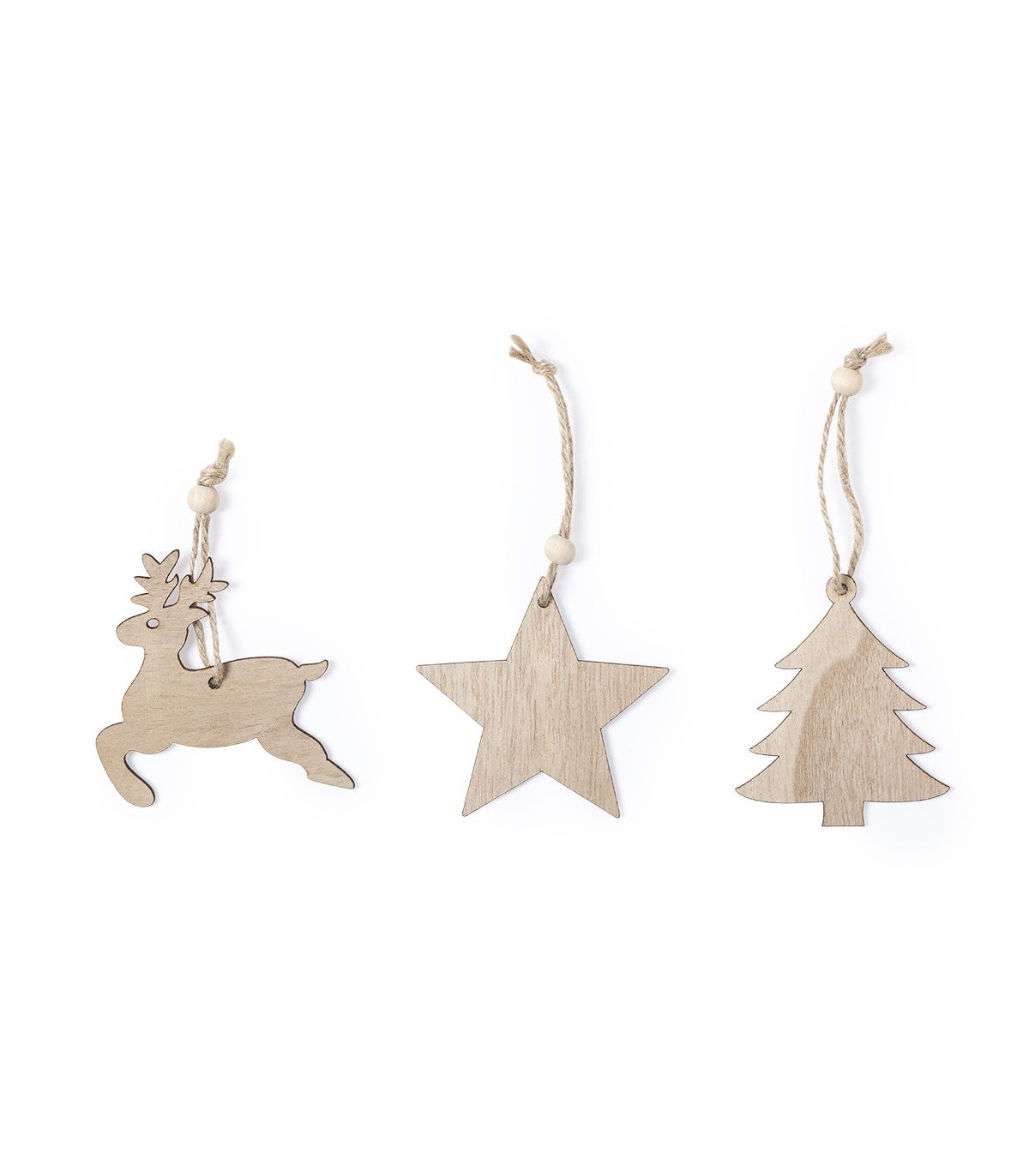 Set de 3 figuras navideñas de línea ecológica para colgar, fabricadas en madera de tacto suave. Cordón en yute con bolita para ajuste. Incluye reno, estrella y árbol de navidad. Presentado en bolsa individual con cartón interior en color natural.