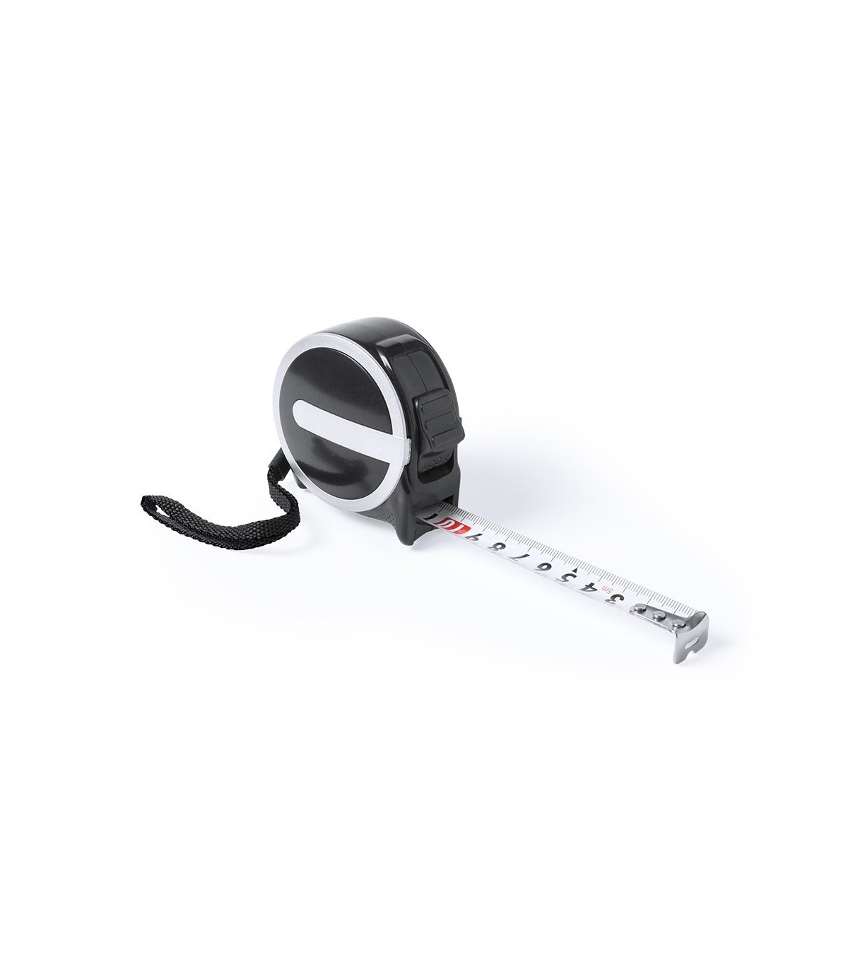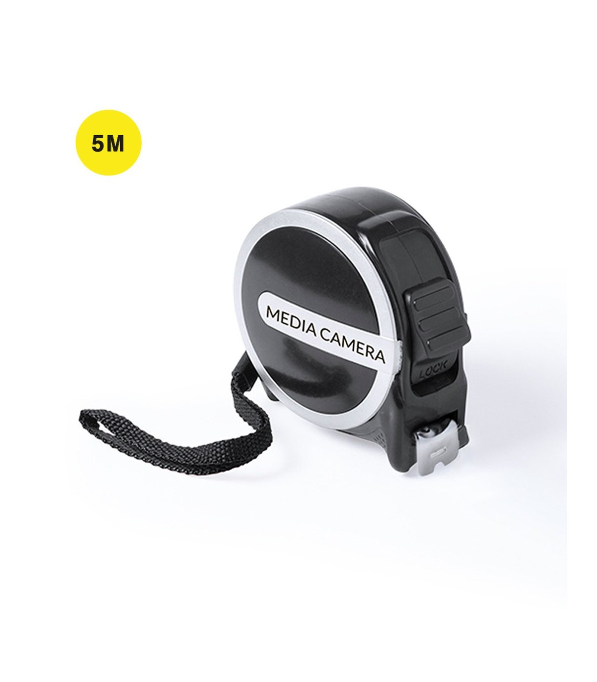 Flexómetro de 5 metros con cuchilla metálica y mecanismo de bloqueo. Con cuerpo de suave acabado especialmente diseñado para marcaje en tampografía. Con clip metálico para cinturón y cinta de transporte. Presentado en caja individual.