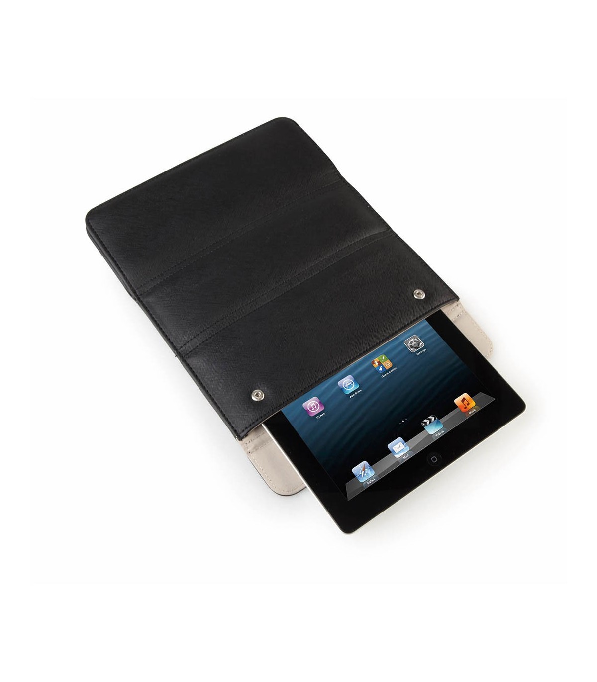Original funda en suave polipiel para tablets de hasta 10 pulgadas, convertible en soporte de dos posiciones según plegado, Con doble cierre de corchete y práctica cinta bandolera ajustable.