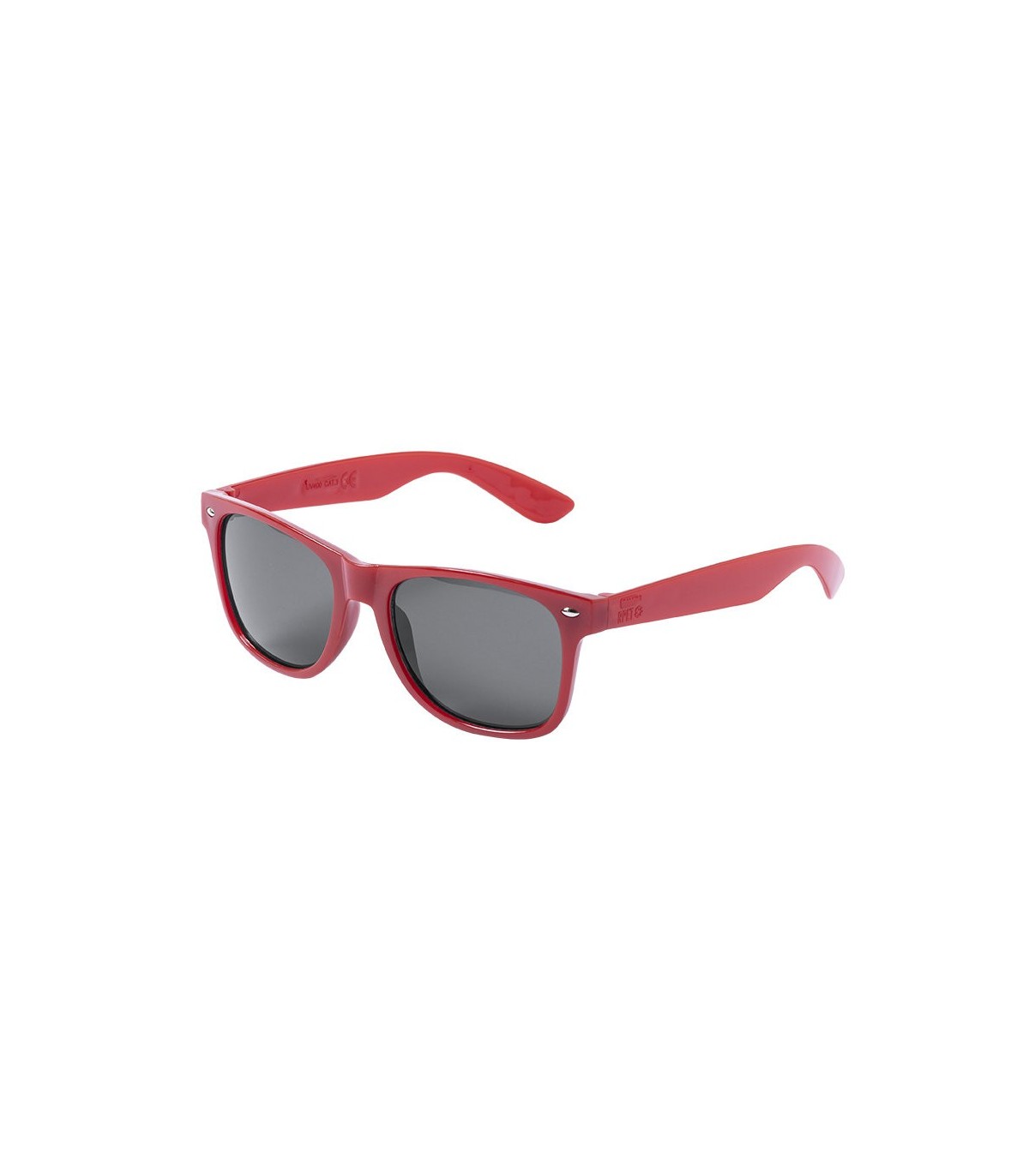 Gafas de sol de fabricación ecológica con protección UV400. Montura y patillas en RPET, elaborado a partir de plástico reciclado para así fomentar la reutilización de residuos plásticos y contribuir a la sostenibilidad del planeta. Lentes AC (acetato de celulosa) en color negro, disponibles en variada gama de colores. Presentada en atractiva bolsa de diseño eco.