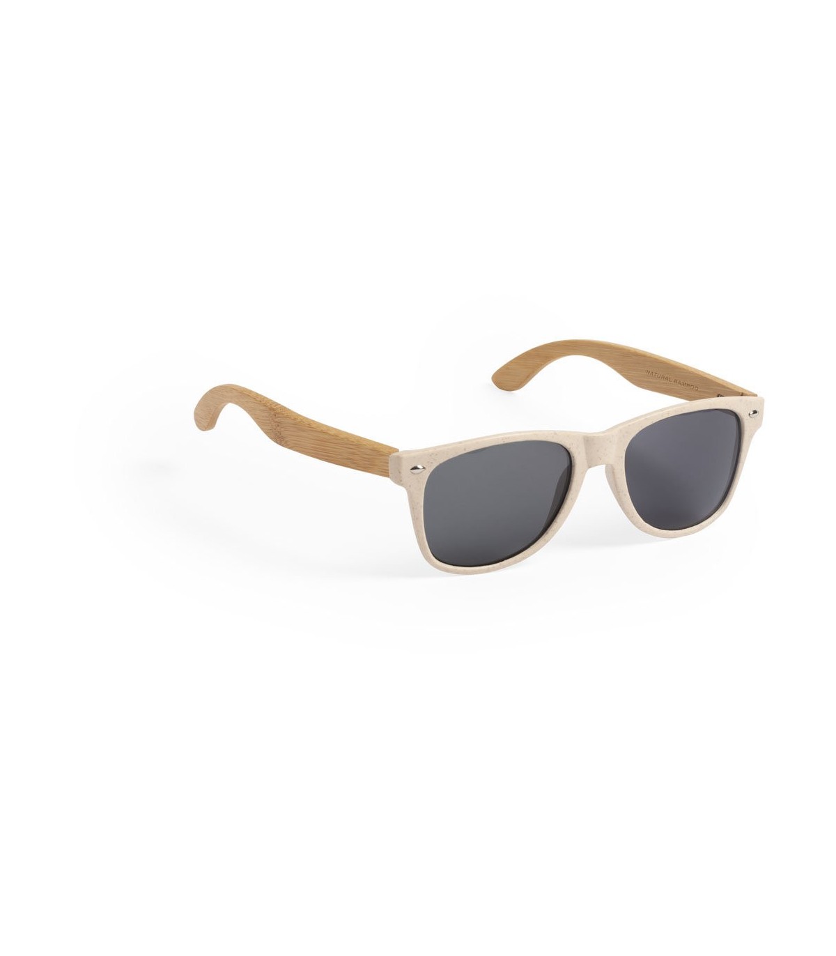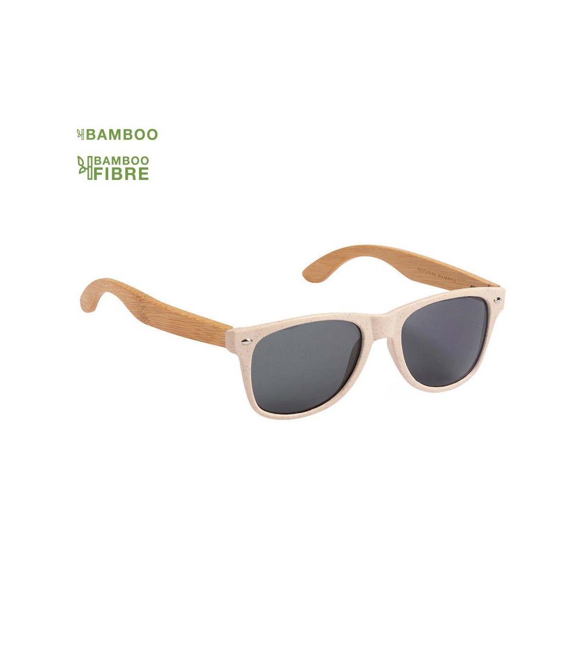 Gafas de sol promocionales con protección UV400. Con montura en fibra de bambú con vetas y patillas en bambú. Lentes tintadas a juego.