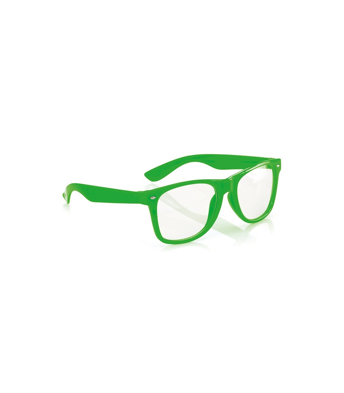 Divertidas gafas de clásico diseño con lentes transparentes y brillante montura en difrentes colores muy llamativos fluorescentes.