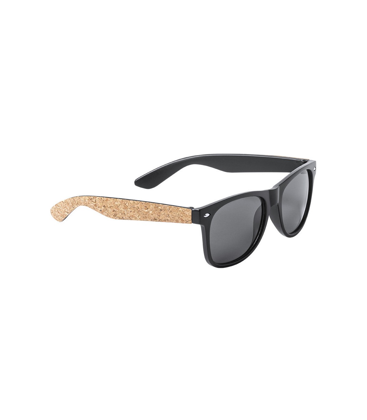 Gafas de sol ecológicas con protección UV400. Montura negra en resistente material PC, con lentes tintadas a juego y patas con recubrimiento de corcho natural.
