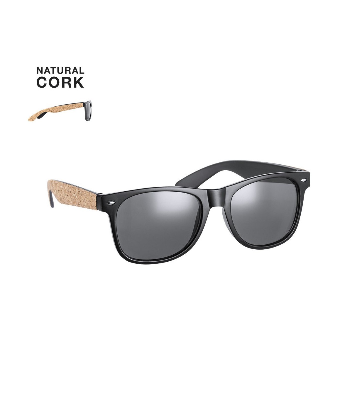 Gafas de sol de fabricación ecológica con protección UV400. Montura negra en resistente material PC, con lentes tintadas a juego y patas con recubrimiento de corcho natural. Presentadas en atractivo estuche de diseño eco.