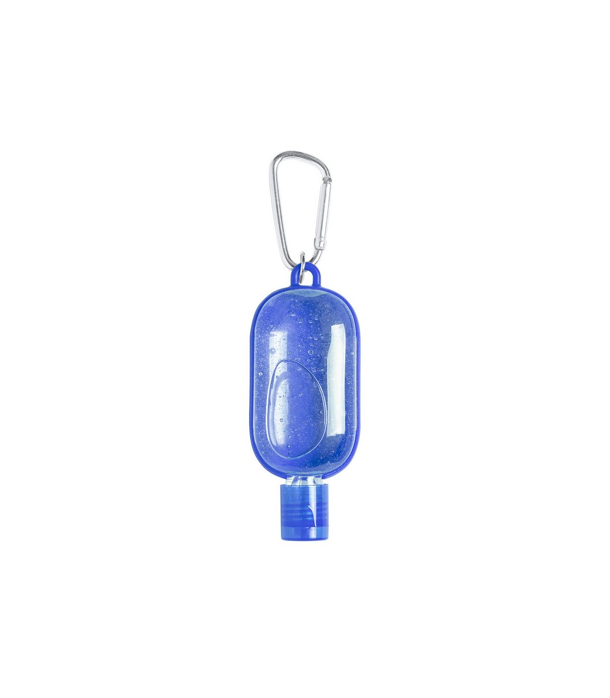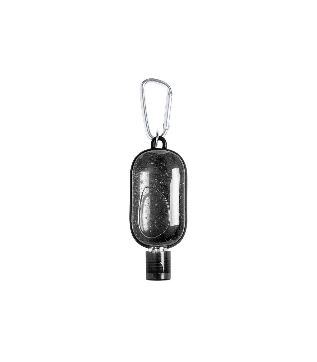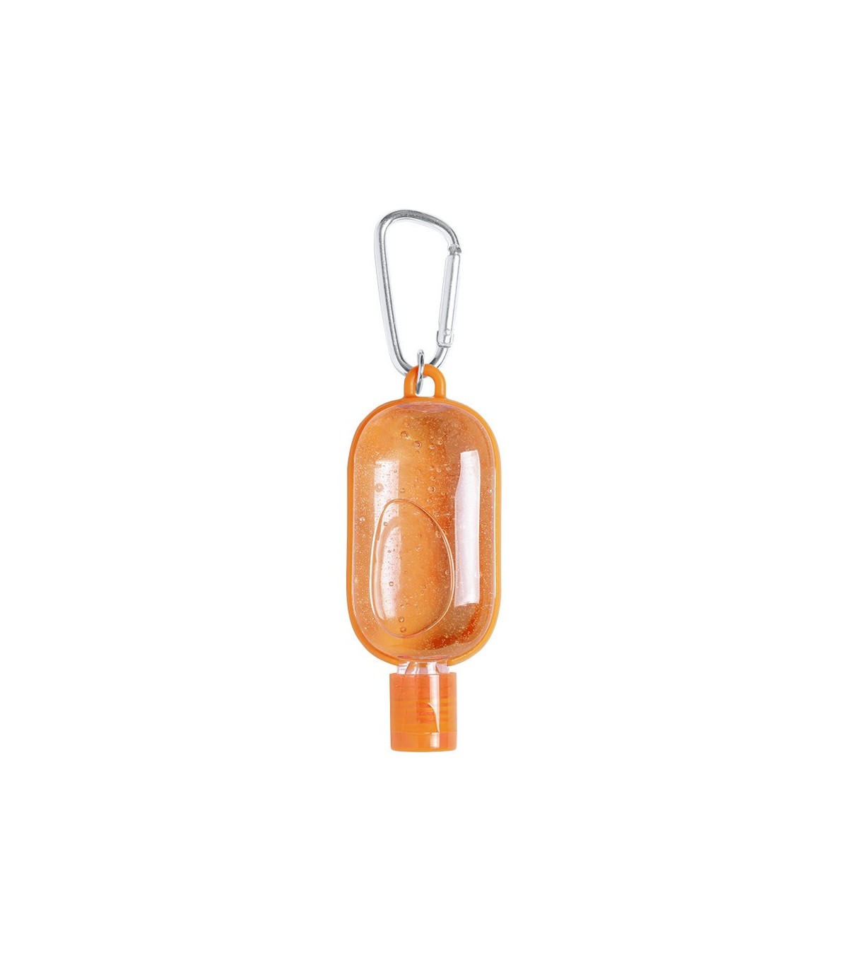 Bote de Gel hidroalcohólico rellenable de 30 ml, con mosquetón para transporte. Con extracto balsámico de Aloe Vera, fácil aplicado con el uso del dosificador.