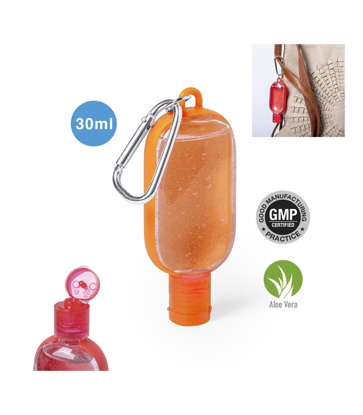 Gel hidroalcohólico para higiene y limpieza de la piel en bote rellenable de 30 ml, con extracto balsámico de Aloe Vera. Cuerpo en variada gama de colores, con dosificador, tapón de seguridad y mosquetón para transporte / fijación. Solución con 65% de contenido de alcohol. Artículo con certificación GMP (Good Manufaturing Practices / Normas de Correcta Fabricación) que garantiza el cumplimiento de rigurosas medidas de control para la obtención de un producto seguro y de calidad. Disponible certificación 94/62/EC. Artículo con certificación GMP (Good Manufaturing Practices / Normas de Correcta Fabricación) que garantiza el cumplimiento de rigurosas medidas de control para la obtención de un producto seguro y de calidad.
