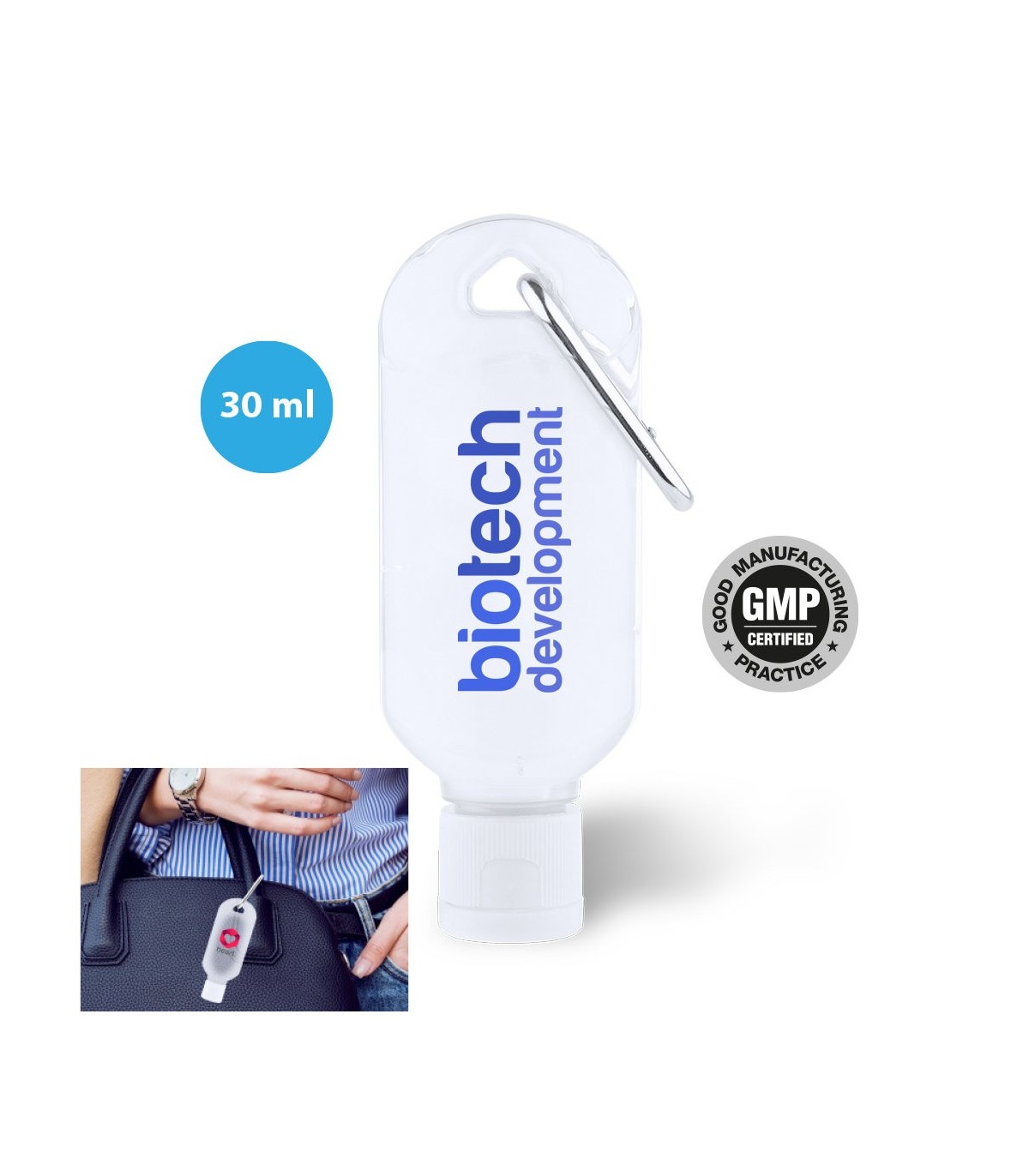 Gel hidroalcohólico para higiene y limpieza de la piel en bote rellenable de 30 ml. Cuerpo en color transparente, con dosificador, tapón de seguridad y mosquetón para transporte / fijación. Solución con 65% de contenido de alcohol. Artículo con certificación GMP (Good Manufaturing Practices / Normas de Correcta Fabricación) que garantiza el cumplimiento de rigurosas medidas de control para la obtención de un producto seguro y de calidad.