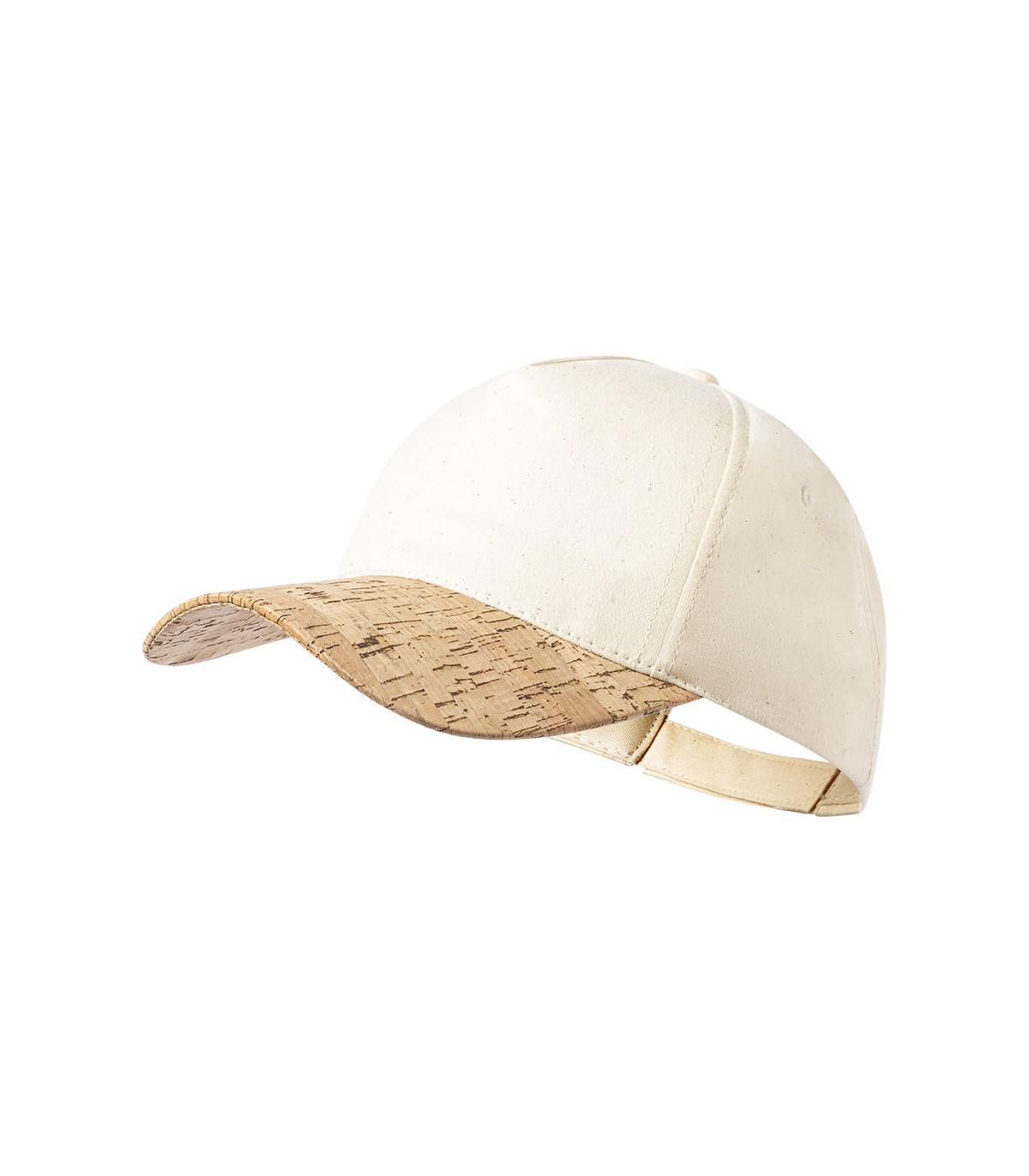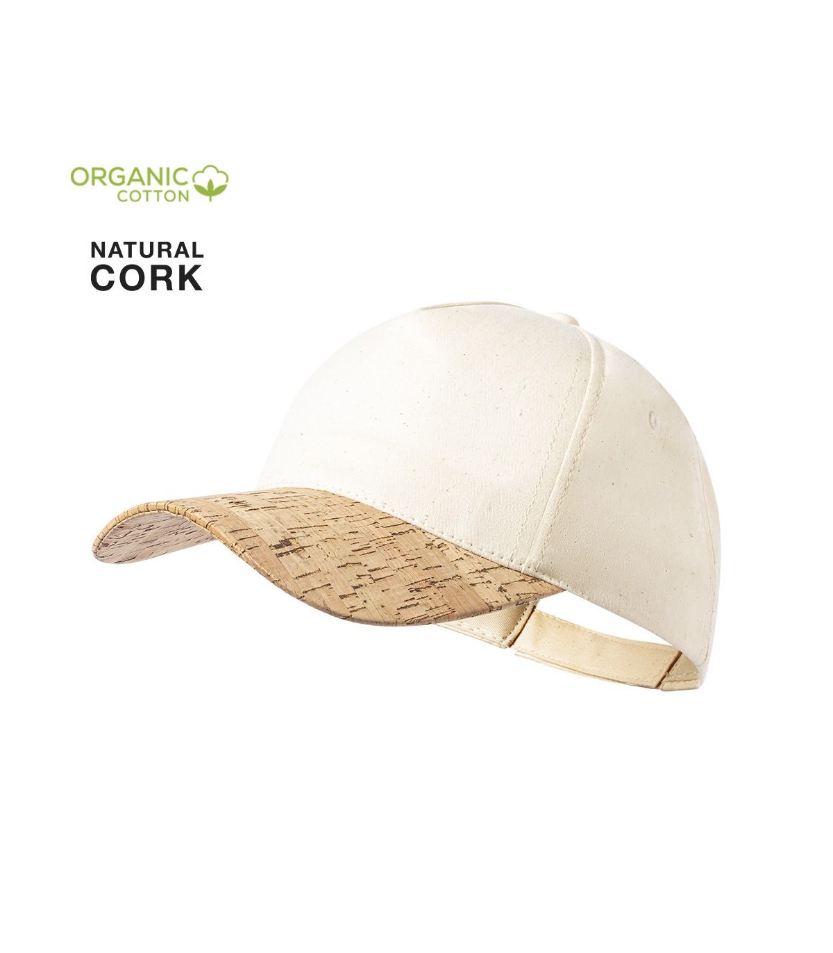 Gorras promocionales ecológicas de 5 paneles fabricada en algodón orgánico, con visera en corcho natural. Con cierre ajustable de velcro.