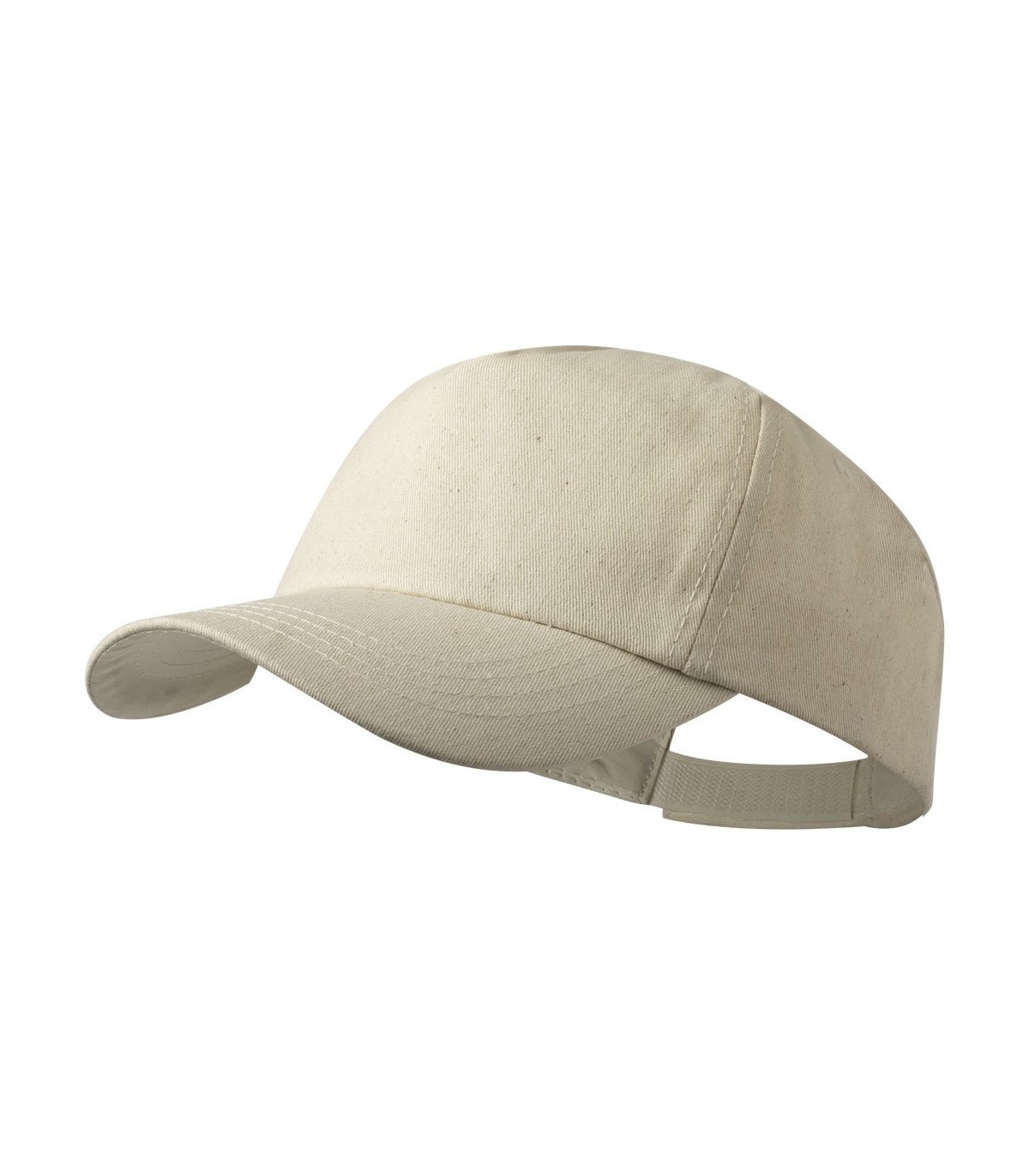 Gorra de fabricación ecológica. 5 paneles en algodón orgánico de suave acabado crudo. Con cierre ajustable de velcro y orificios de ventilación bordados, con distintivo en etiqueta.