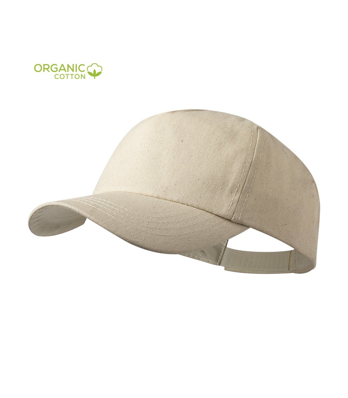 Gorras 100% ecológicas promocionales, con 5 paneles y hechas en algodón orgánico crudo. Con cierre ajustable de velcro y orificios de ventilación bordados, con distintivo en etiqueta.