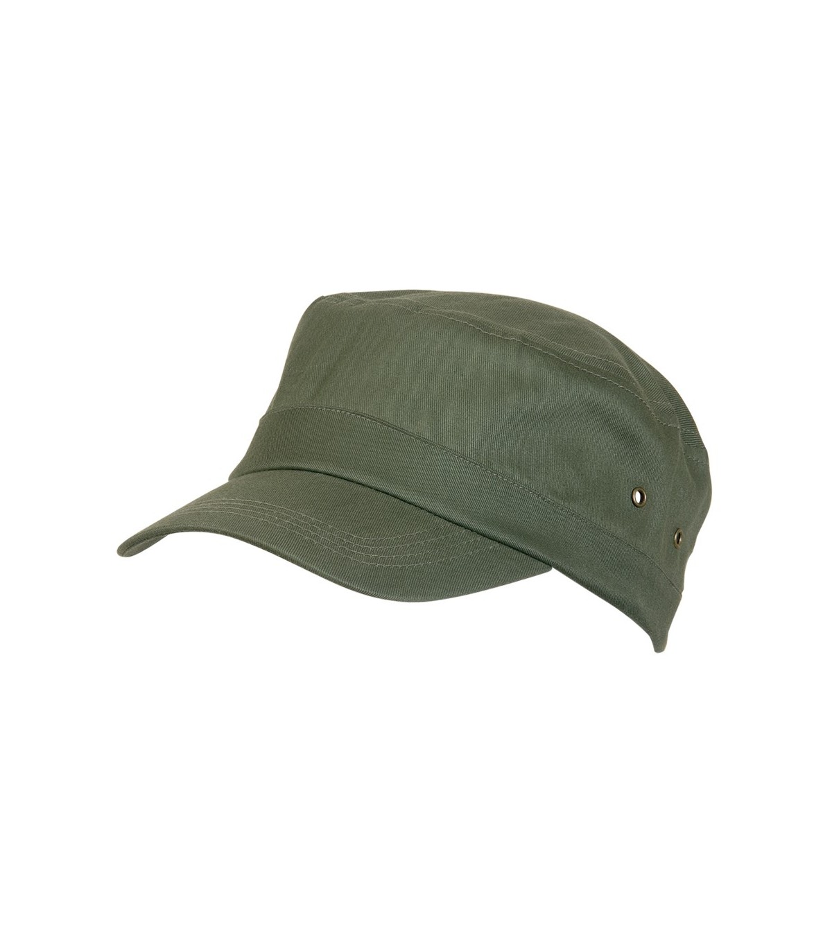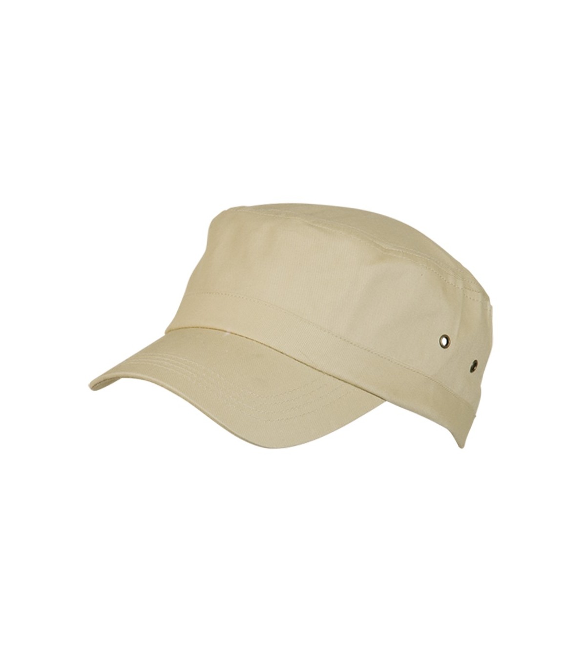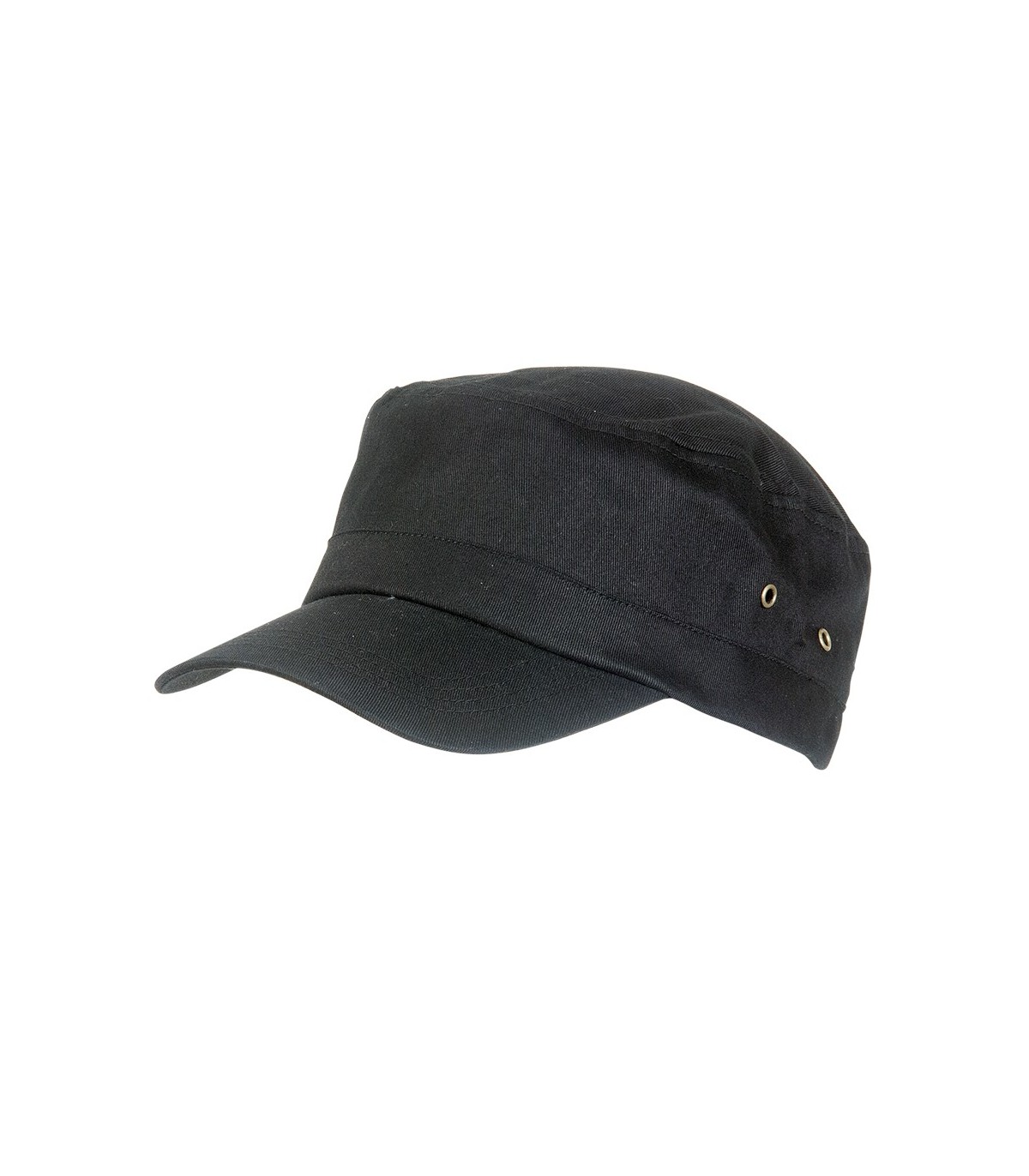 Gorra tipo militar en material 100% algodón peinado y sobrios colores. Con orificios de ventilación laterales reforzados con argolla metálicas y cierre ajustable de velcro.