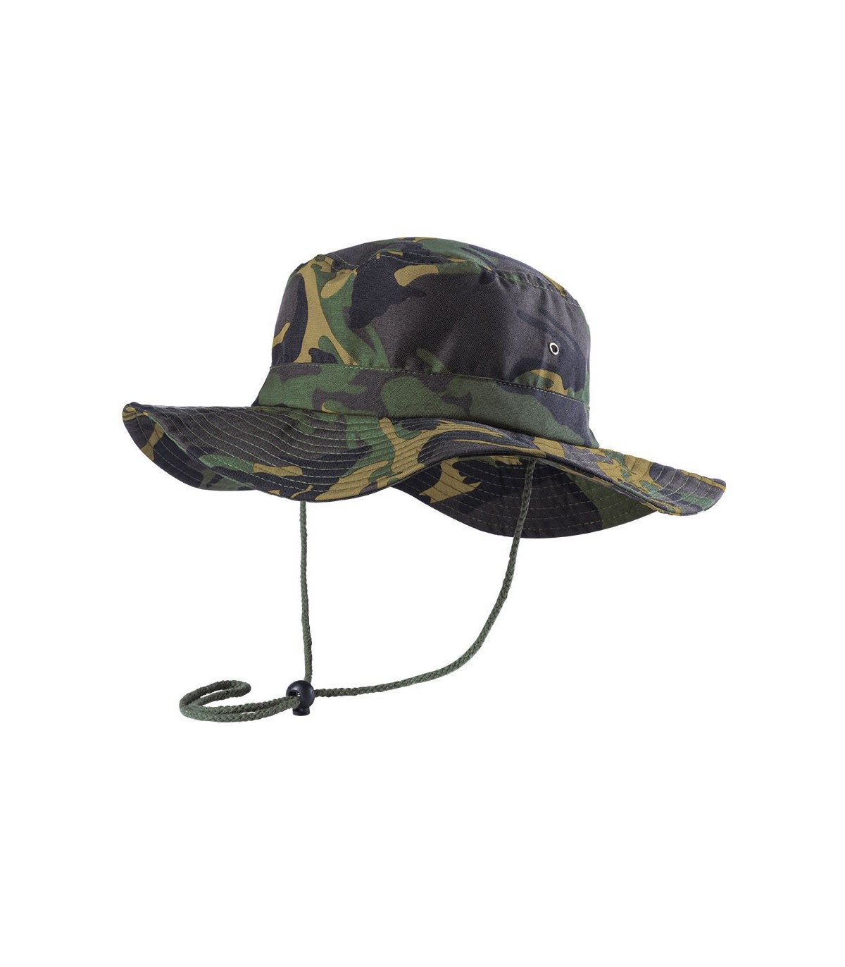 Gorro de camuflaje y aventura en resistente microfibra. Con orificios de ventilación metálicos y cordón en verde militar, con accesorio de ajuste.