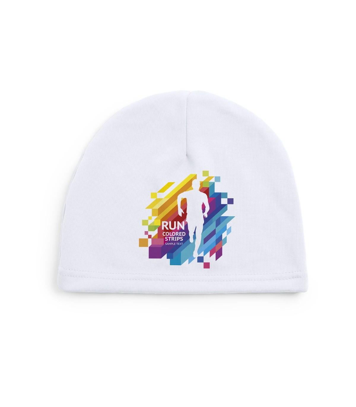 Gorros deportivos promocionales fabricado en poliéster/spandex y coral fleece de 280g/m2, ideales para marcaje en sublimación y serigrafia textil.