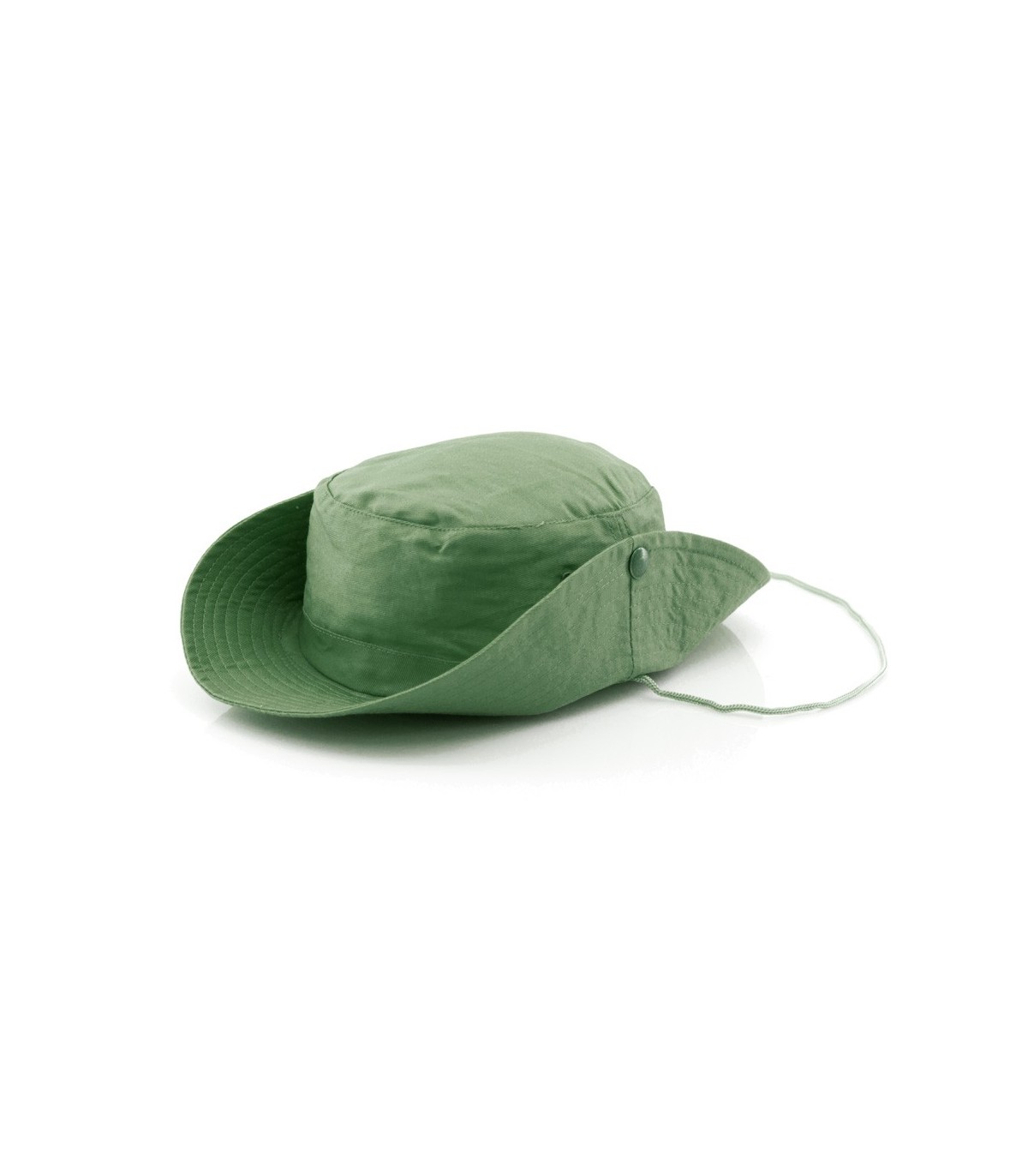 Gorro tipo safari en material 100% algodón. De confortable interior y con orificios de ventilación laterales reforzados con argollas metálicas. Ala ajustable con cierres de corchete metálicos y cordón de transporte a juego.