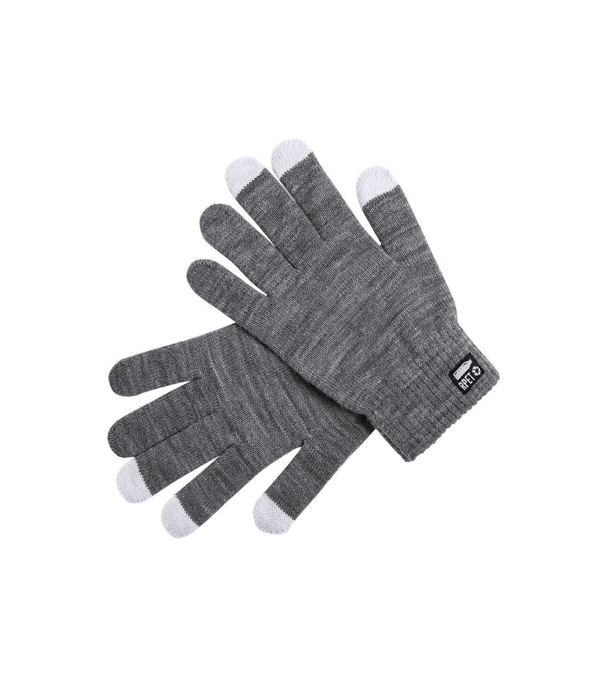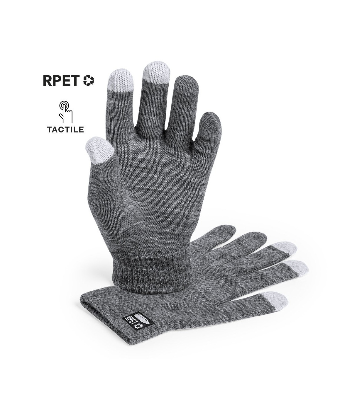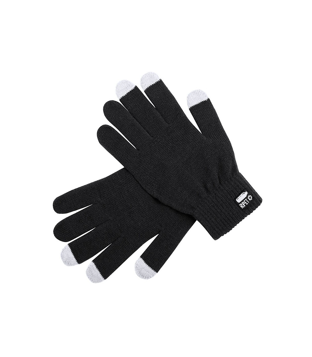 Guantes para dispositivos con pantalla táctil. Elaborados en plástico reciclado con función táctil en dedos corazón, índice y pulgar. Talla única adulto, con distintivo RPET en etiqueta exterior.