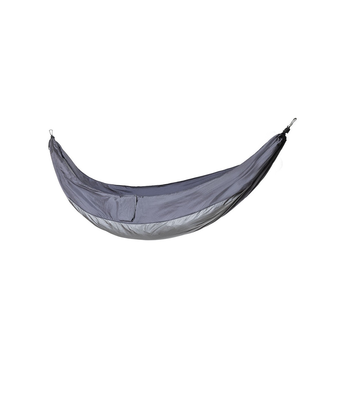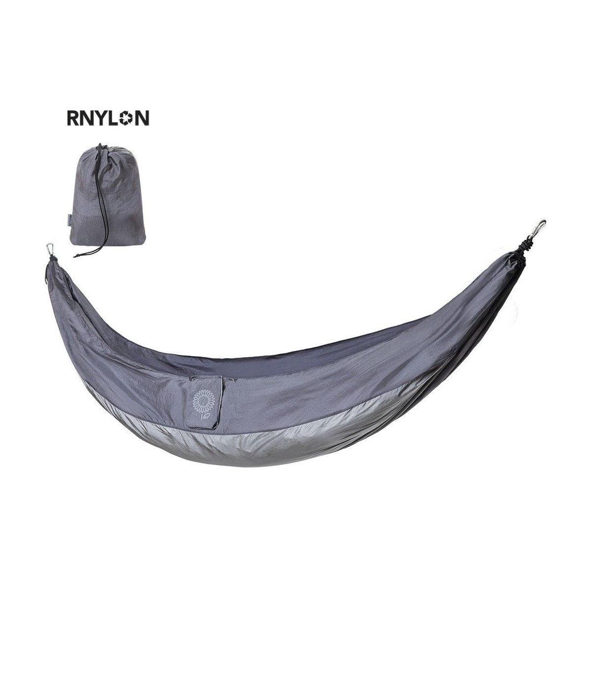 Hamaca en nylon reciclado de 270x140cm, Con cintas de amarre y mosquetones metálicos. Soporta hasta 200kg. Presentación plegado, con cinta ajustable mediante regulador.