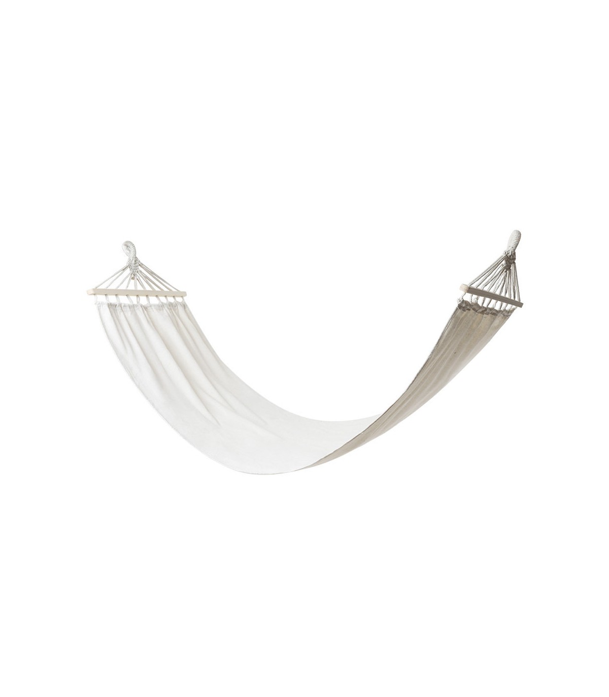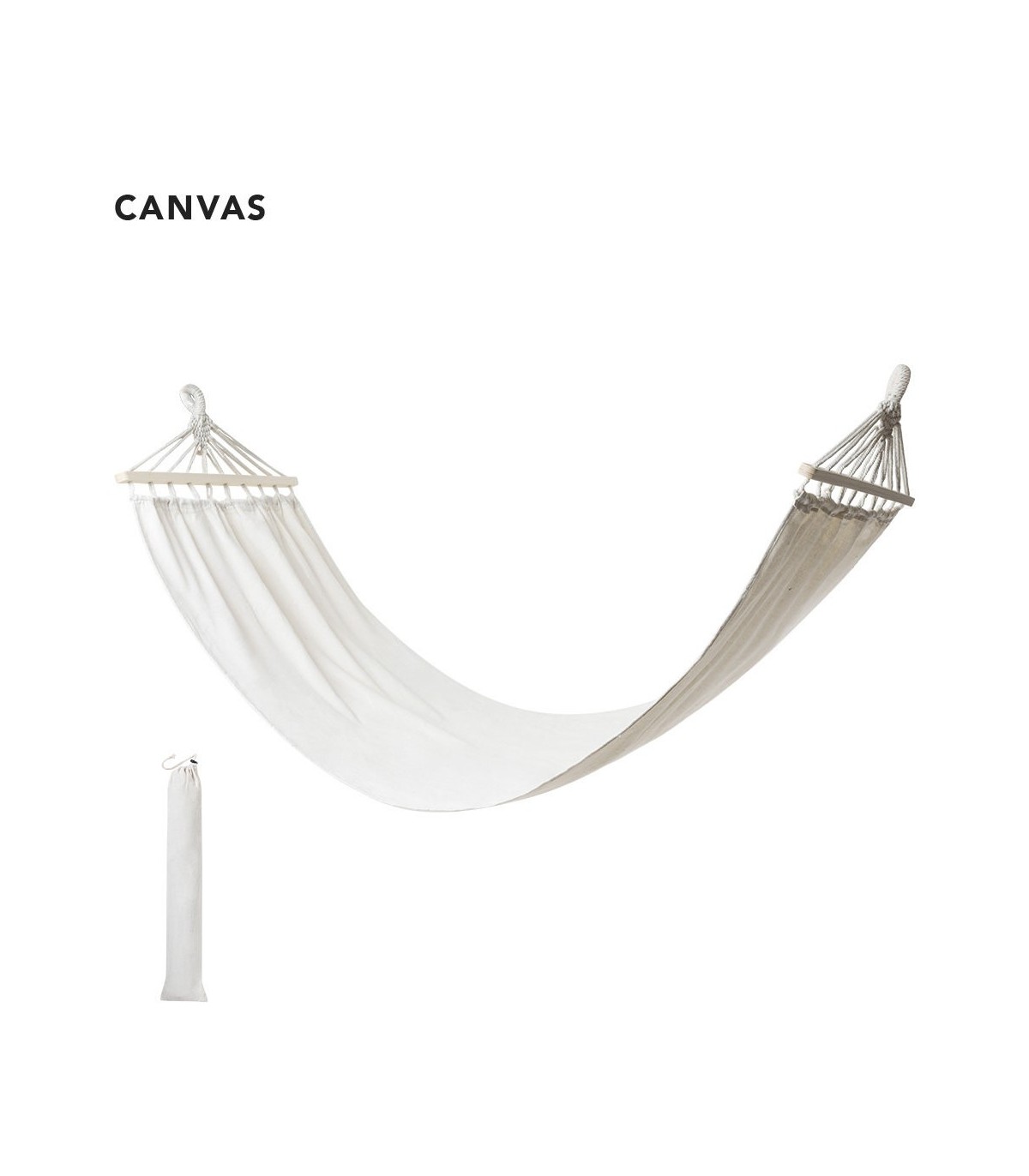 Hamaca elaborada en resistente canvas de 320g/m2 y 190x80cm. Con resistentes cintas de amarre y soportes en madera natural. Soporta hasta 120kg. Presentada en funda de canvas a juego.