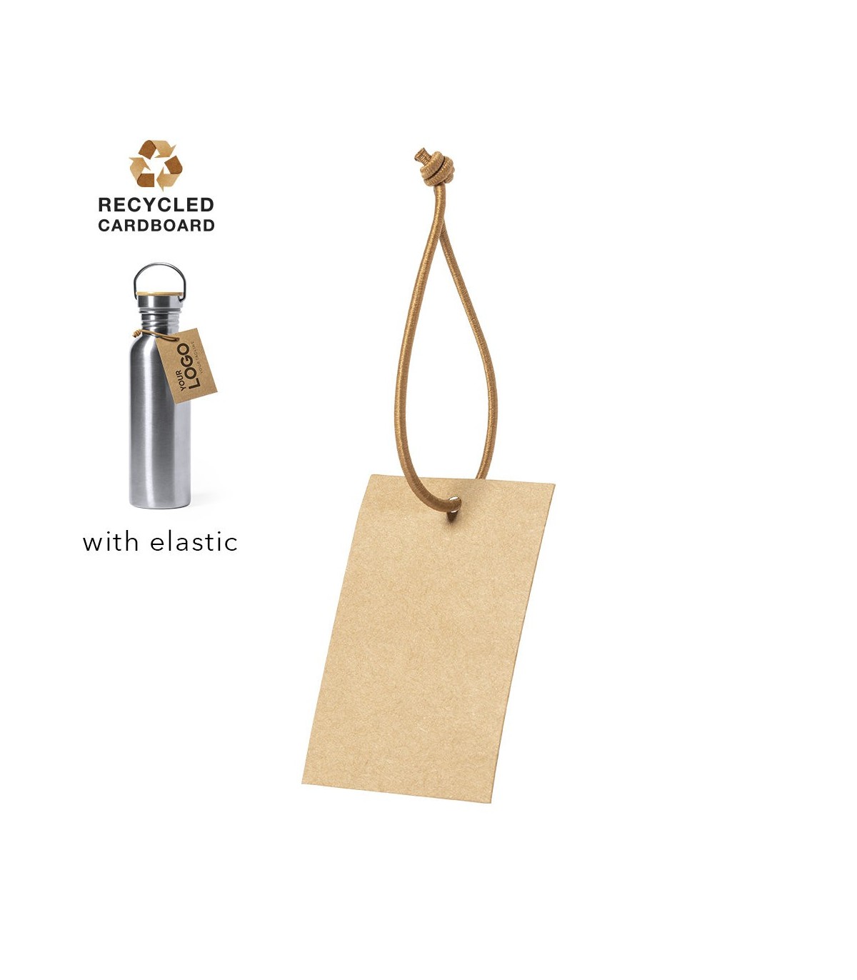 Etiqueta tipo hangtag de presentación, elaborada en cartón reciclado. De acabado kraft, con cuerda elástica para colgar en color marrón a juego. En línea con la tendencia del mercado hacia la sostenibilidad integral del regalo, ofreciendo soluciones de origen reciclado con el fin de ayudar a la mejora y conservación de nuestro planeta.