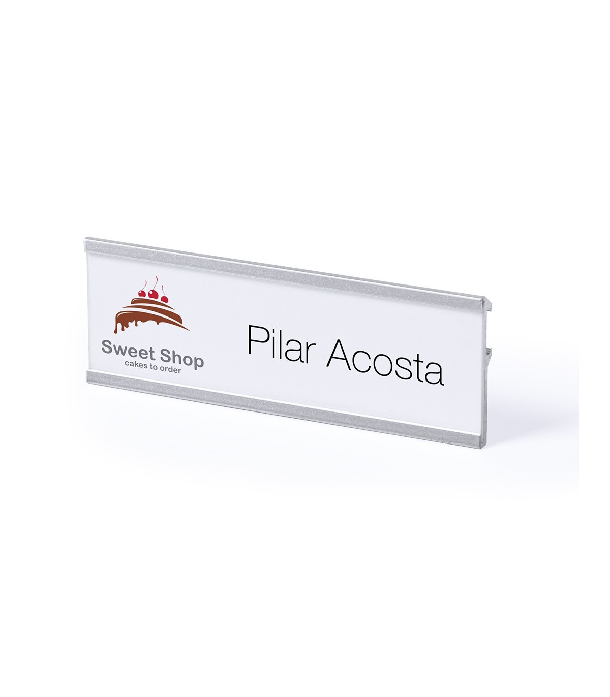 Identificador con marcos de aluminio en acabado anodizado. Parte trasera con pinza de enganche para una fijación segura.