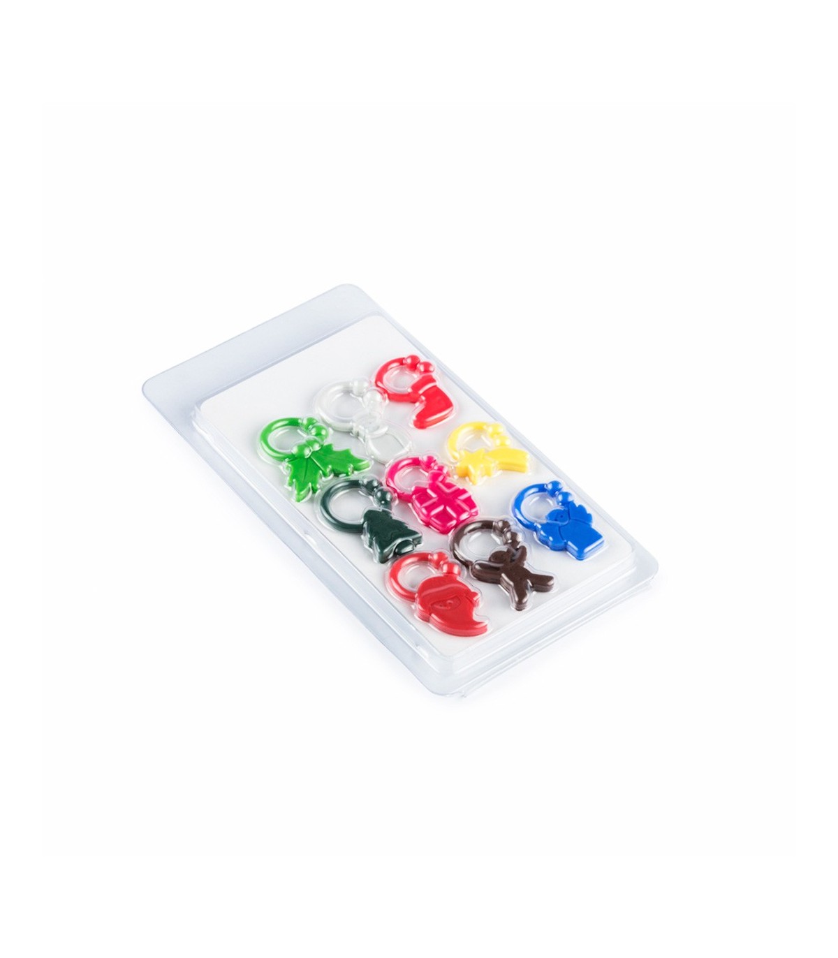 Identificador de copas de silicona en 9 diseños de navidad de vivos colores. Presentado en estuche con compartimentos individuales. Presentado en atractivo bistre de diseño en PVC transparente.