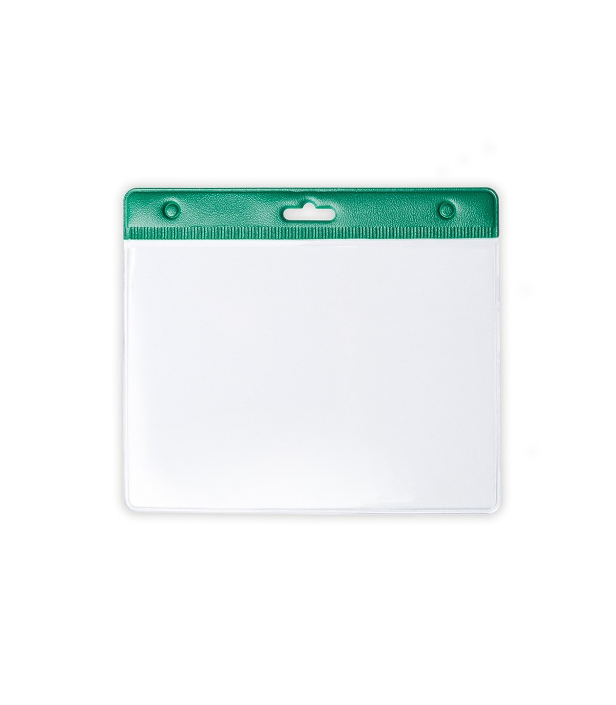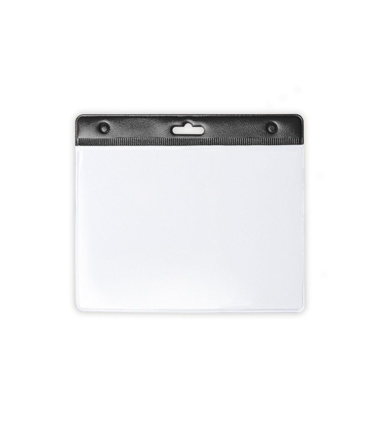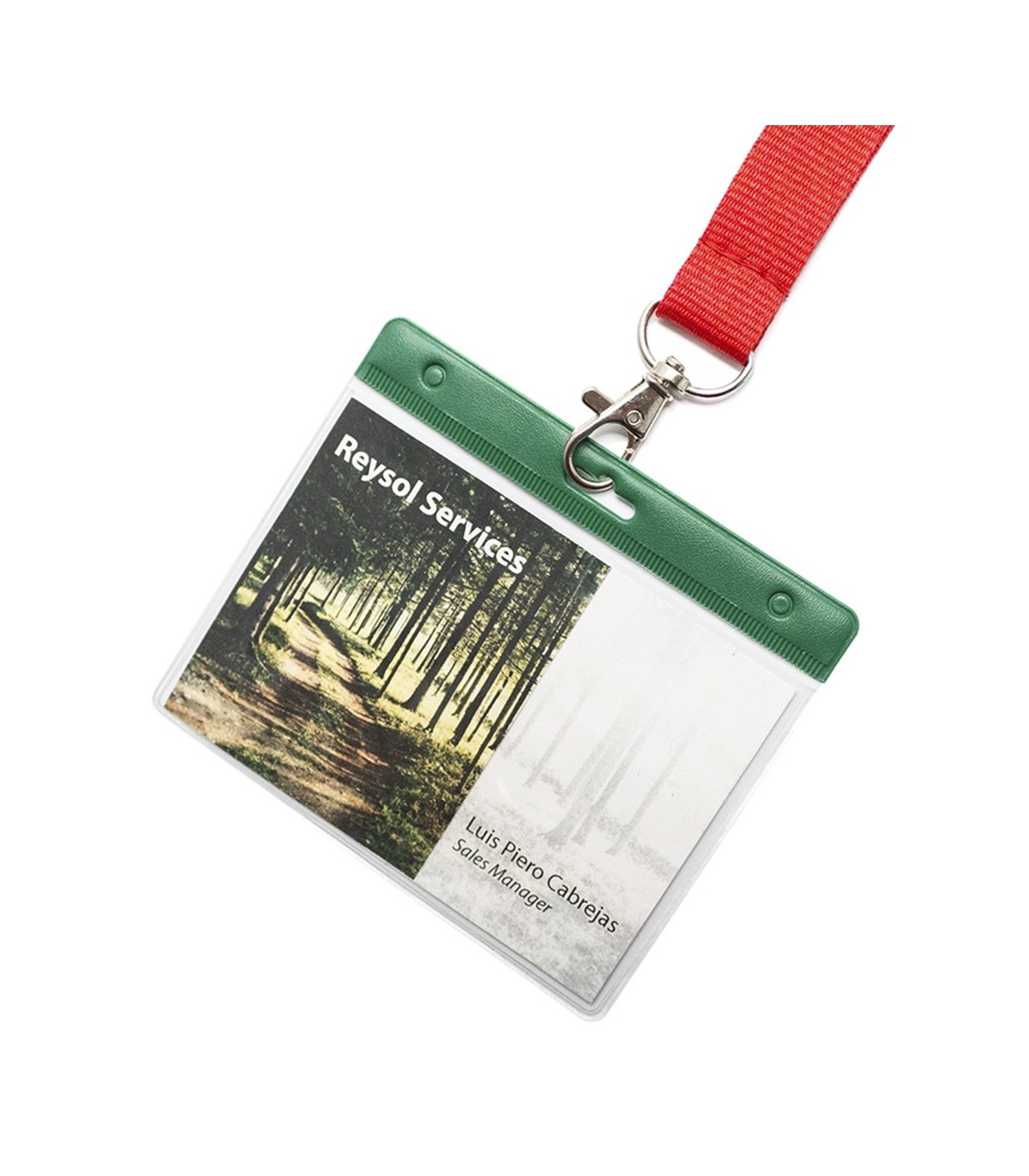 Identificador troquelado en PVC con cabecera en variados colores, ventana frontal transparente y parte trasera en color blanco.