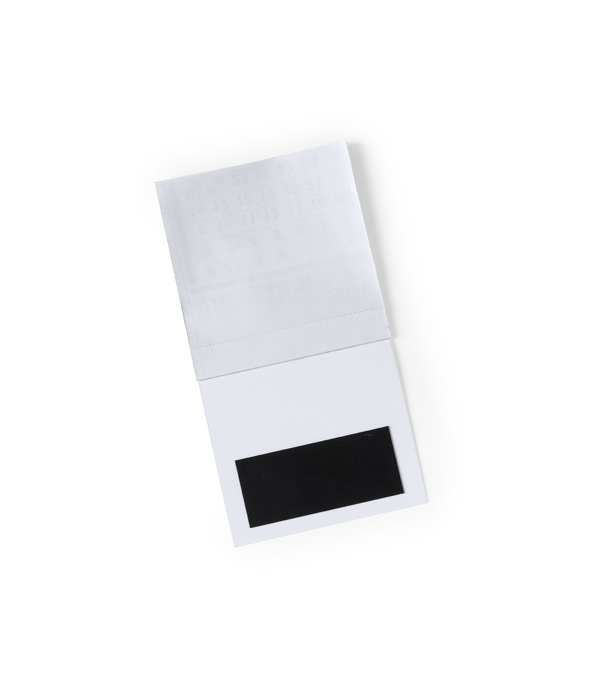 Práctico imán calendario en cartón. Diseño mes en curso y santoral. Con amplia superficie de marcaje.