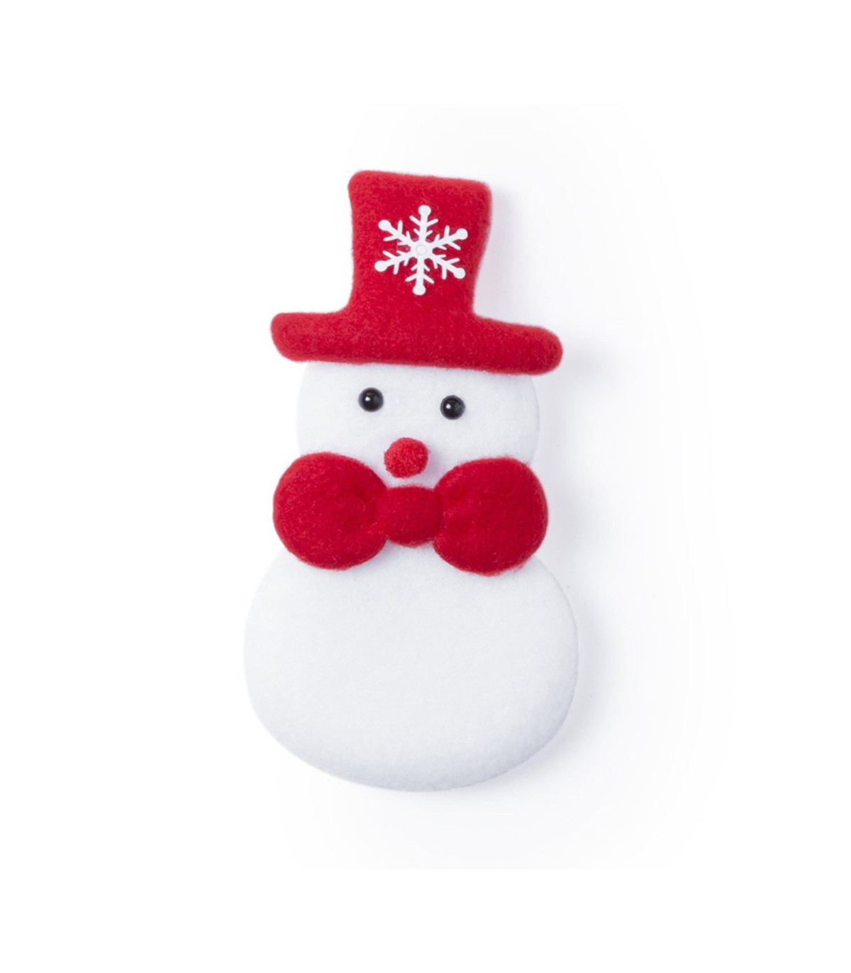 Original imán navideño con figuras de Papá Noel y muñeco de nieve en suave poliéster.