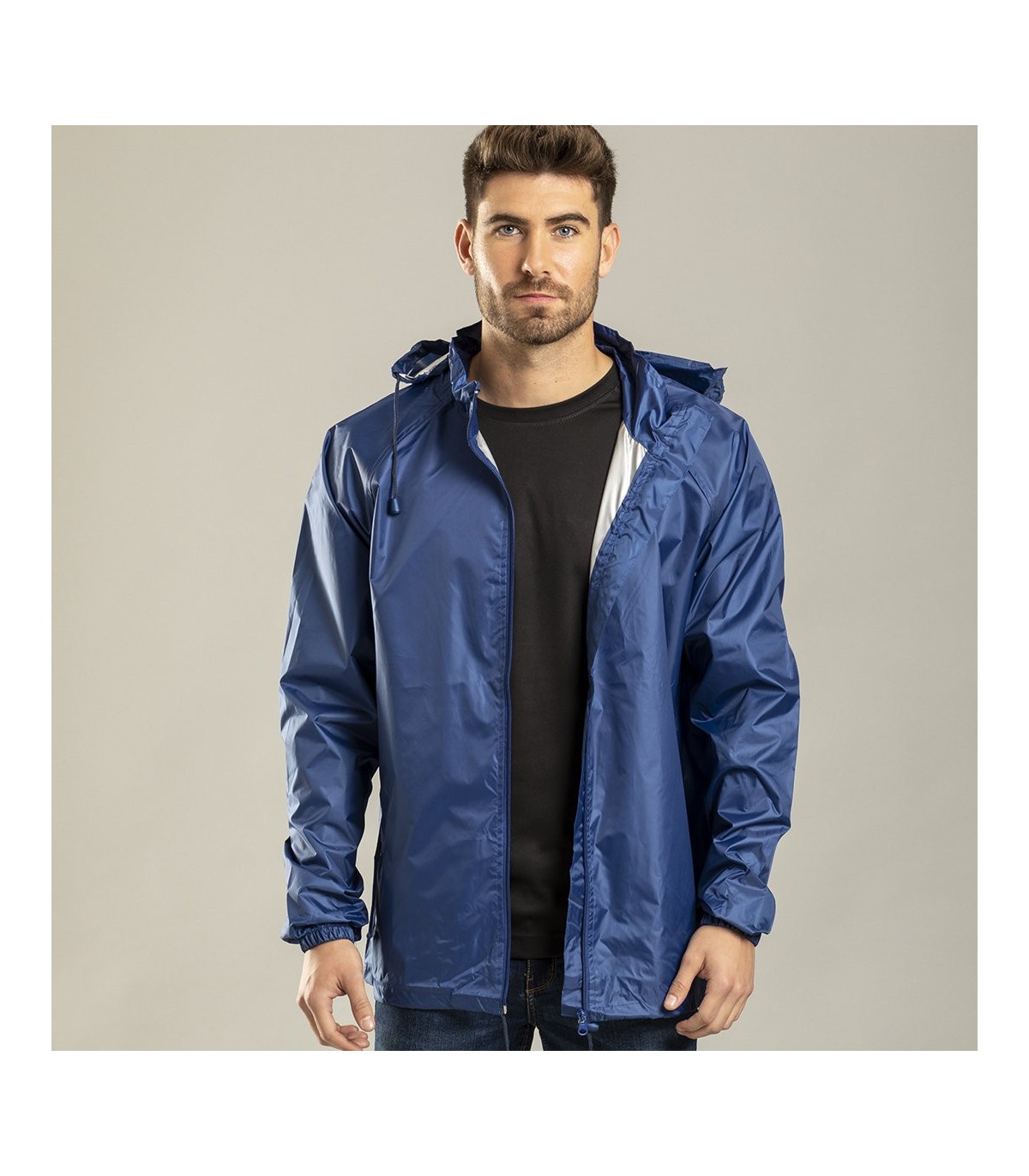 Impermeable en resistente poliéster 210T en diferentes colores para personalizar con tu logo o marca de empresa. Con capucha de cremallera integrada en cuello y cordones de ajuste, cierre principal de cremallera y bolsillos laterales e interiores. Cordón en cintura con accesorio de ajuste. Disponible en tallas M, L, XL, XXL.