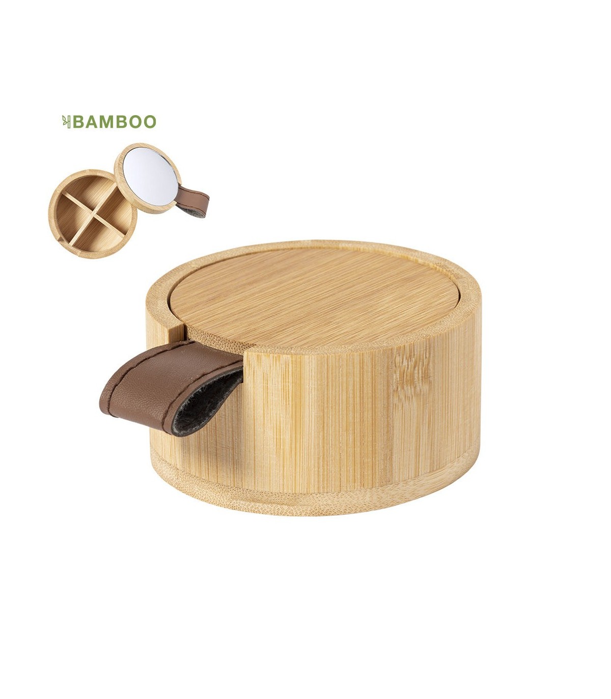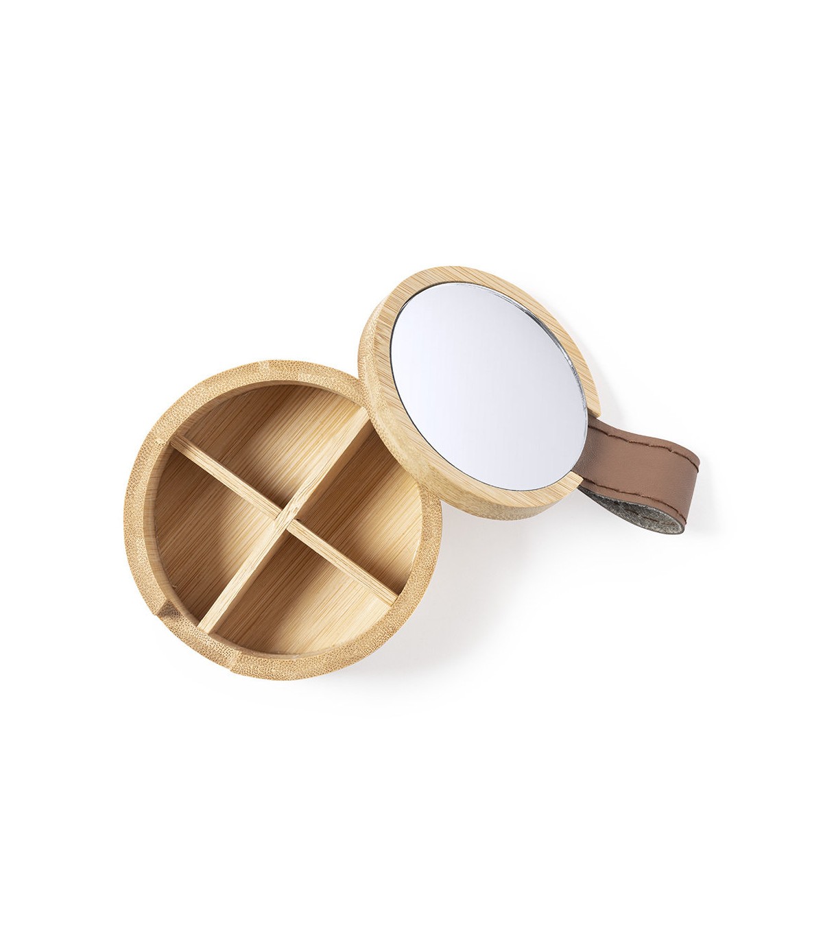 Joyeros ecológicos en bambú. Con 4 compartimentos interiores, tapa con tirador de PU y espejo 1X de 6cm de diámetro integrado en tapa. Con film protector.