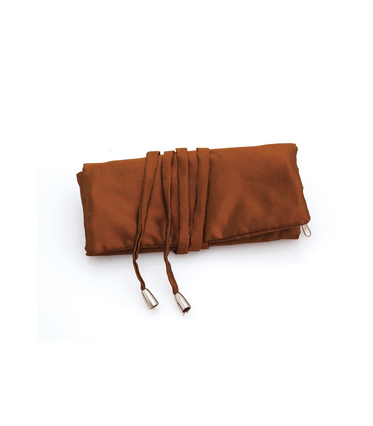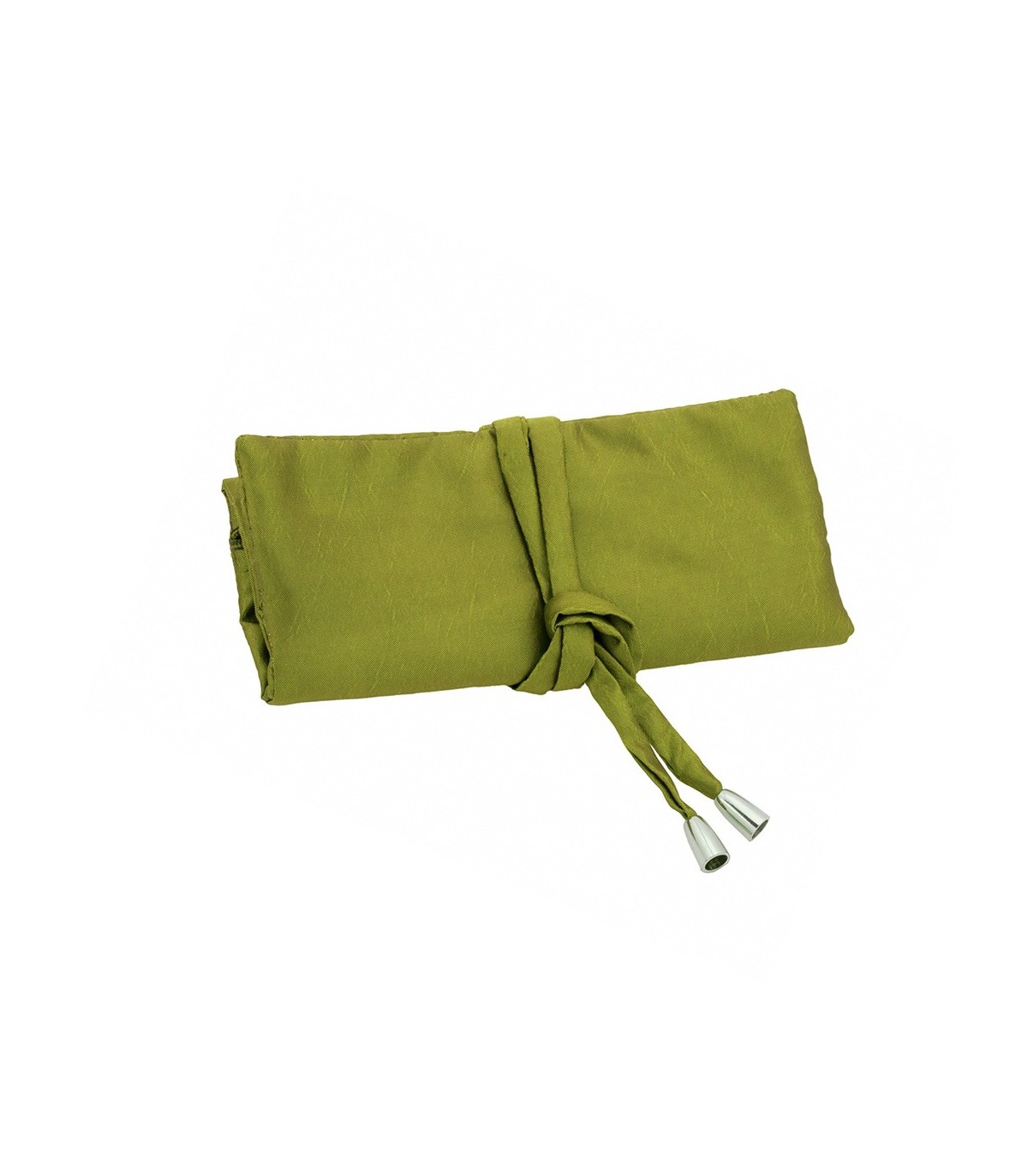 Joyero plegable en suave poliéster de sobrios colores. Con soporte para anillos y dos bolsillos de cremallera a juego. Cierre con cintas rematado con accesorios en color plateado.