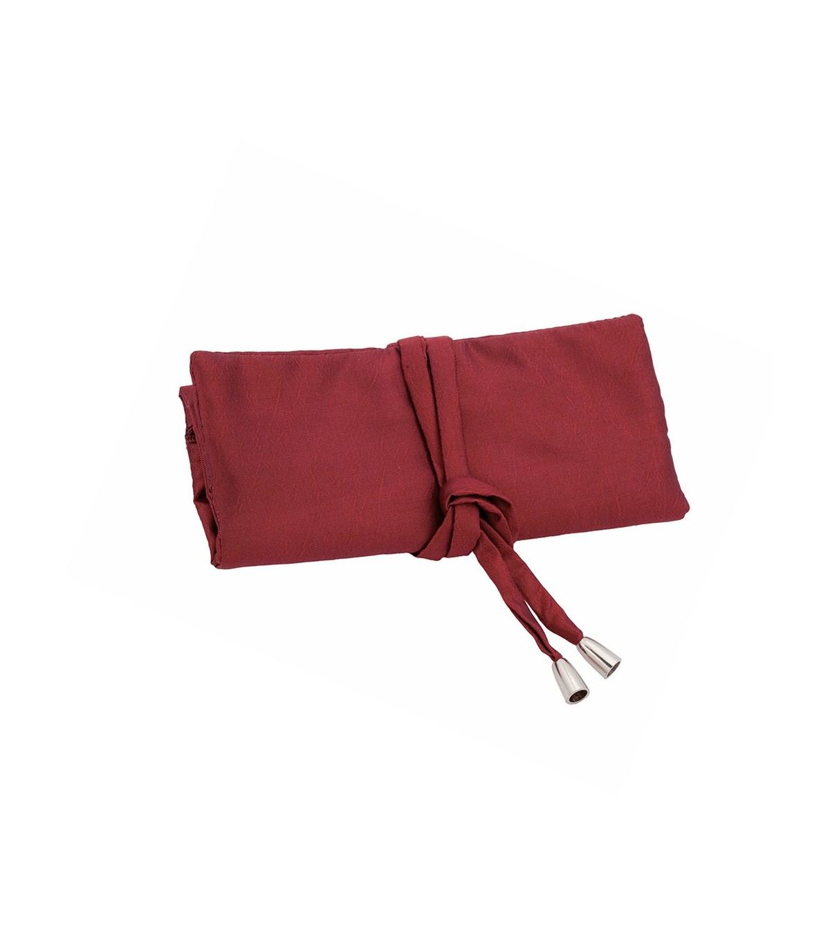 Joyero plegable en poliéster con soporte para anillos y dos bolsillos de cremallera a juego. Cierre con cintas rematado con accesorios en color plateado.