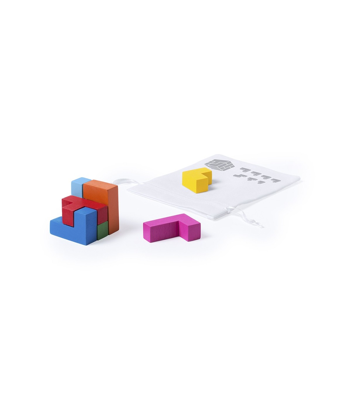 Juego de habilidad 3D en madera con piezas de vivos colores. Presentado en funda individual de poliéster personalizados para regalos promocionales.