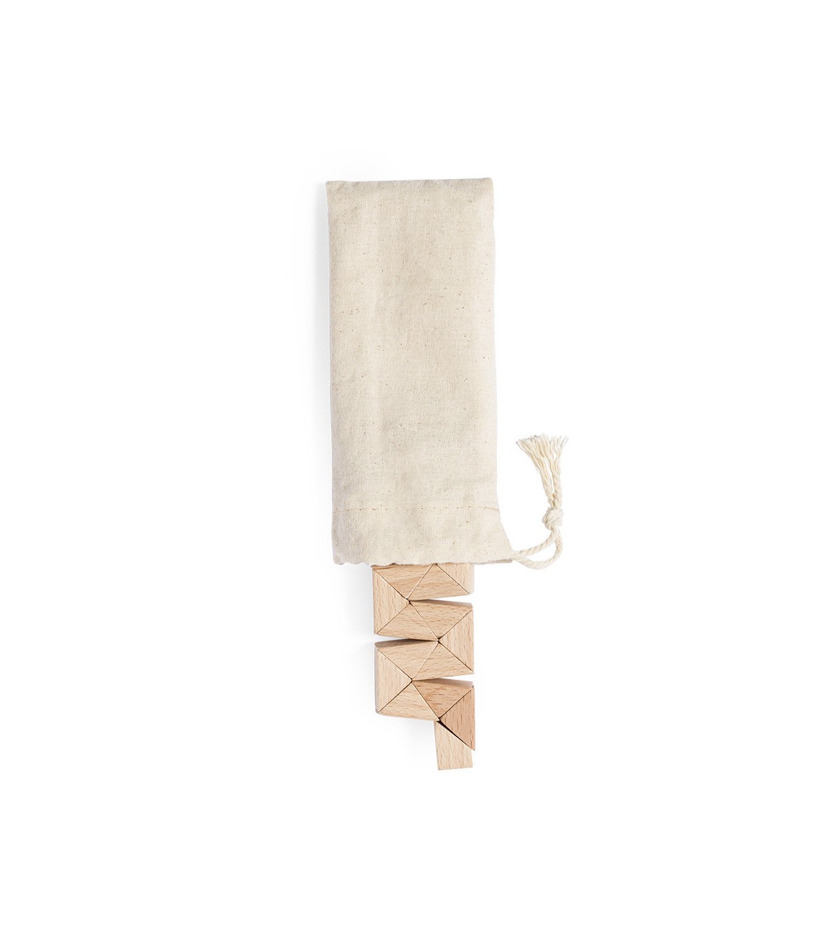 Juego de habilidad para los más creativos. Fabricado en madera y presentado en resistente funda de algodón natural con cierre de cordón.