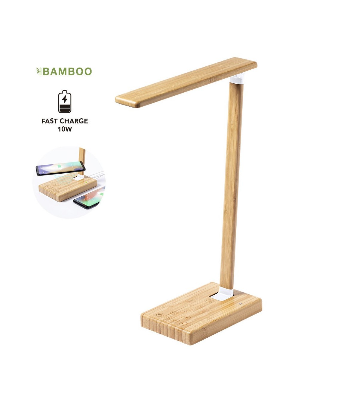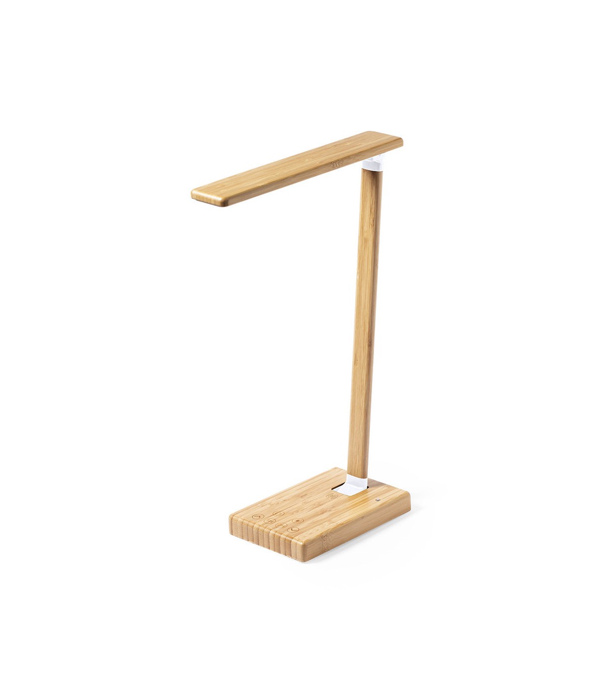 Lámpara cargador plegable de fabricación ecológica. elaborada en bambú procedente de cortes naturales y con base antideslizante. Cargador inalámbrico 10W integrado. Incluye 25 LEDs y 3 posiciones de iluminación (cálida, fría y media) e intensidad regulable. Incluye temporizador de 1H y 2H para la luz; y una salida USB. Compatible con dispositivos móviles de carga inalámbrica, con cable cargador tipo C y viene presentada en una atractiva caja de diseño eco. Disponible manual de instrucciones en español e inglés.