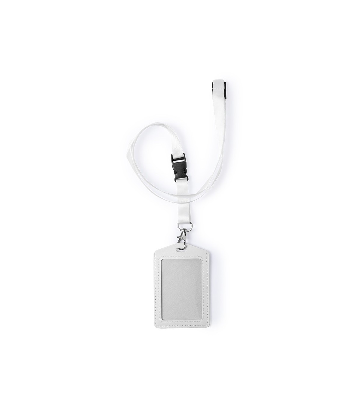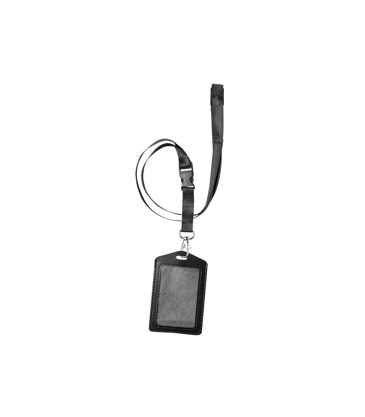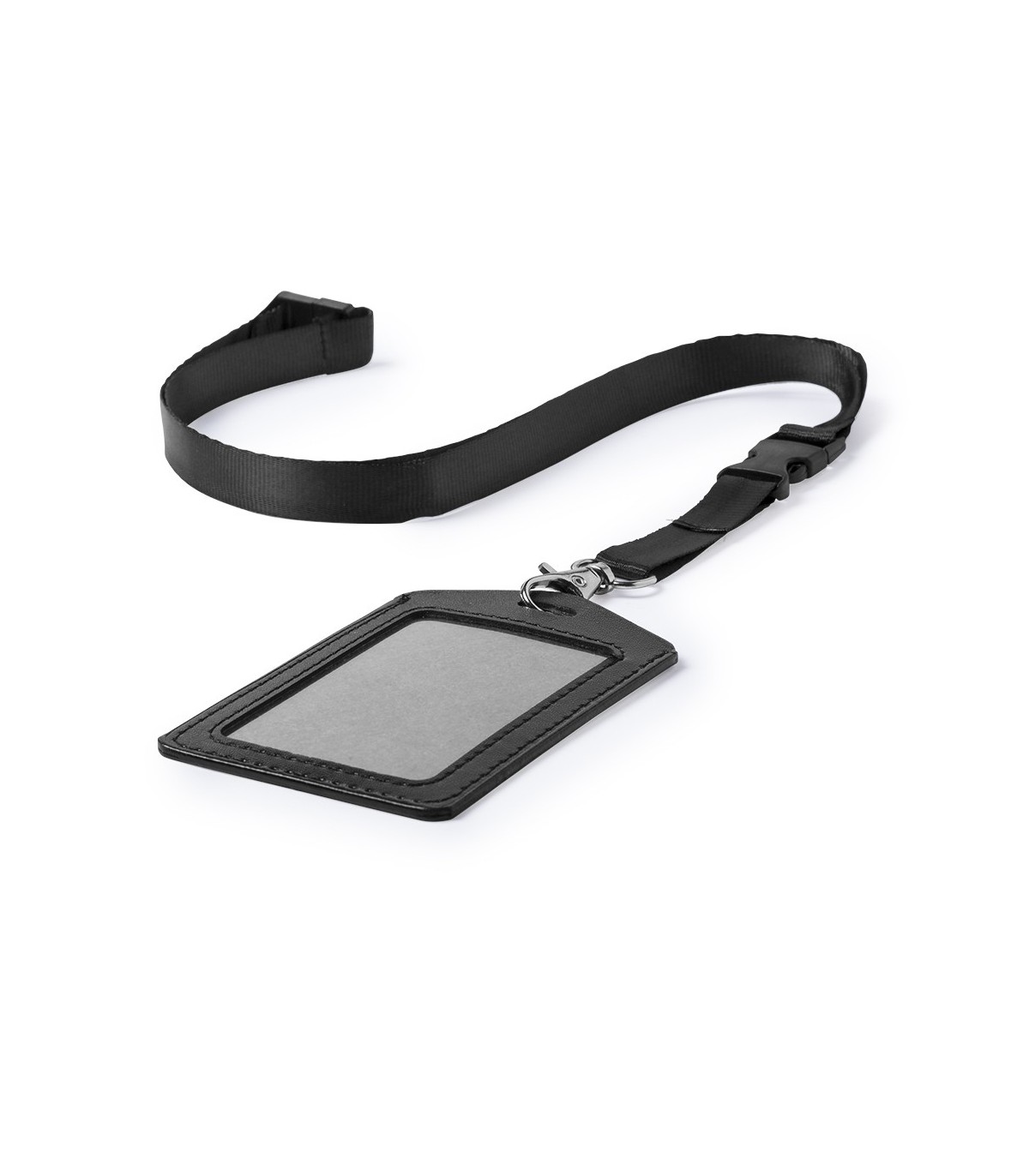 Lanyard con identificador a juego. Lanyard en resistente poliéster, con accesorio de seguridad en el cuello y cierre buckle para fácil manejo de la identificación, con mosquetón de ajuste. Identificador en polipiel, con ventana de PVC y ranura para tarjeta de fácil inserción. Conjunto disponible en colores blanco y negro.